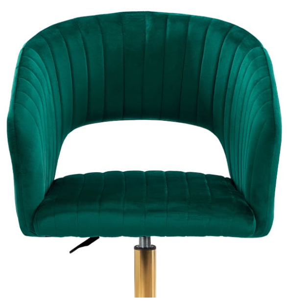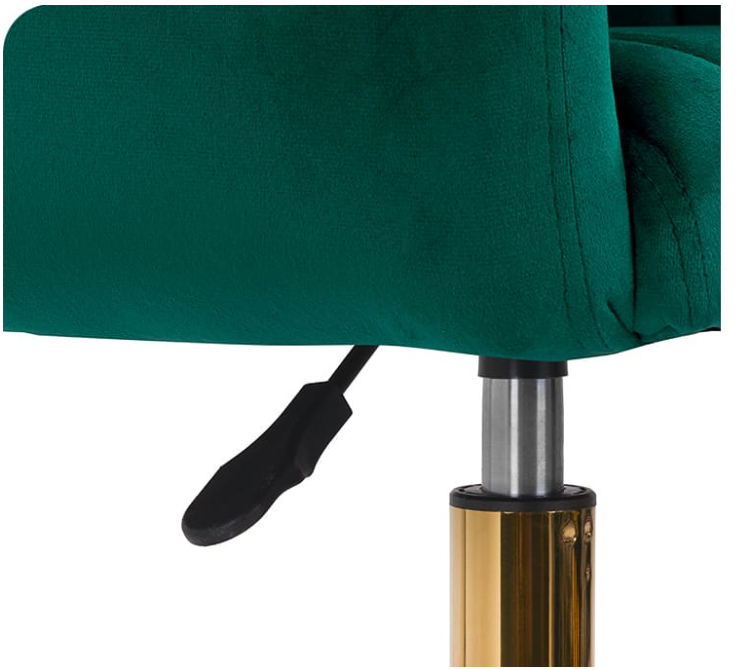 Starostlivá povrchová úprava robí nábytok pútavým. Na dotyk príjemné zamatové čalúnenie v odtieňoch zelenej mu dodáva jedinečný charakter . Podnož v zlatých odtieňoch dodáva eleganciu, dokonale ladí so zamatom a funkčné kolieska zaisťujú mobilitu , uľahčujú premiestňovanie stoličky a pohyb po obývačke pri práci. Estetika spracovania, pohodlie pri používaní, ozdobné prešívanie a ergonomicky profilované operadlo predurčuje stoličku splniť požiadavky aj tých najnáročnejších užívateľov .