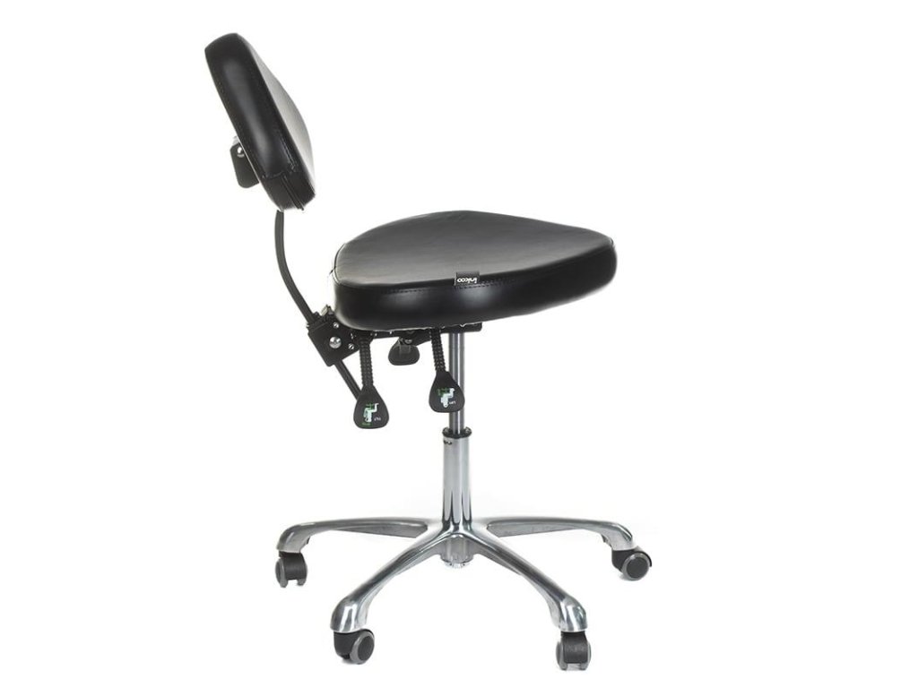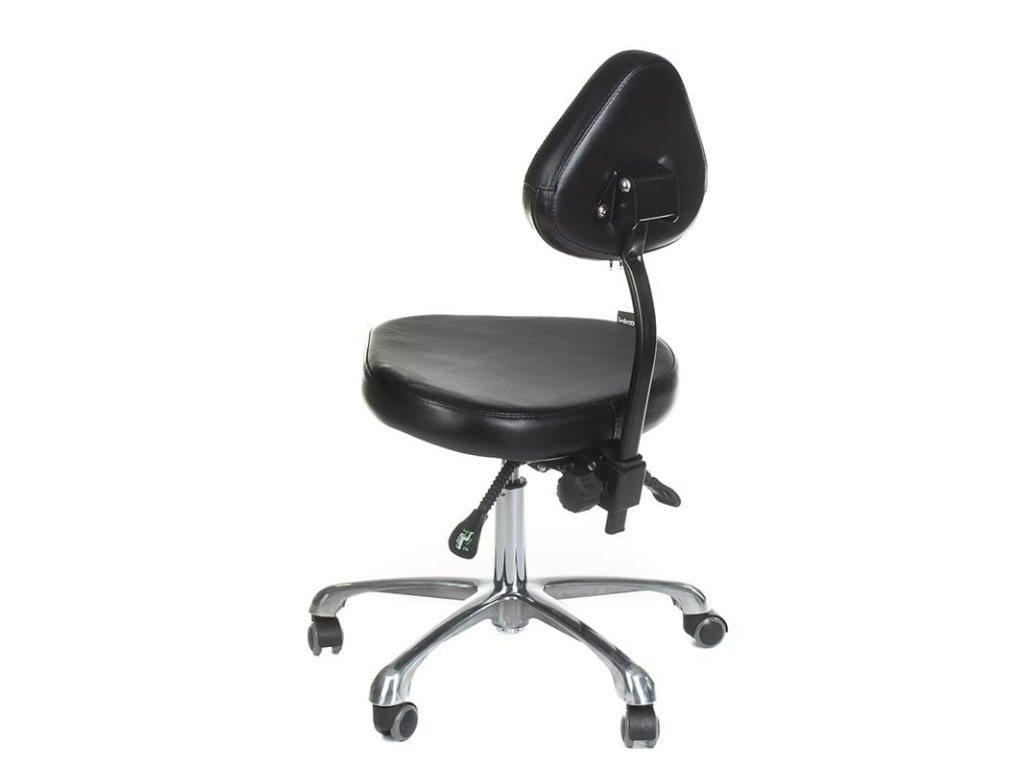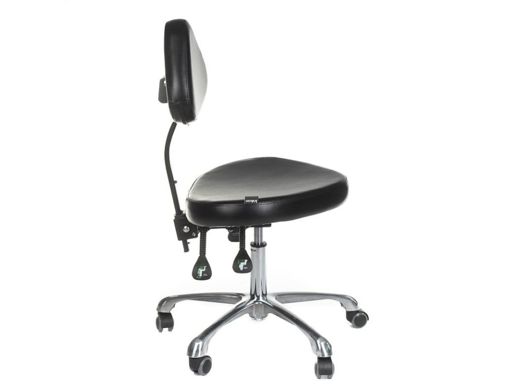 Pevná oceľová základňa vybavená 5 pogumovanými kolieskami. Vankúš je vyrobený z vysoko kvalitnej pružnej peny. Čalúnenie je vyrobené z vysoko kvalitnej ekologickej kože, ktorá sa ľahko čistí. Hydraulicky výškovo nastaviteľné. Funkcia TILT - uhol sklonu sedadla pri práci. Hydraulicky nastaviteľná poloha sklonu operadla. Manuálne nastaviteľná výška chrbtovej opierky. Možnosť prednej aj zadnej sedačky.