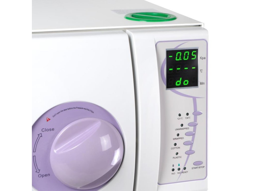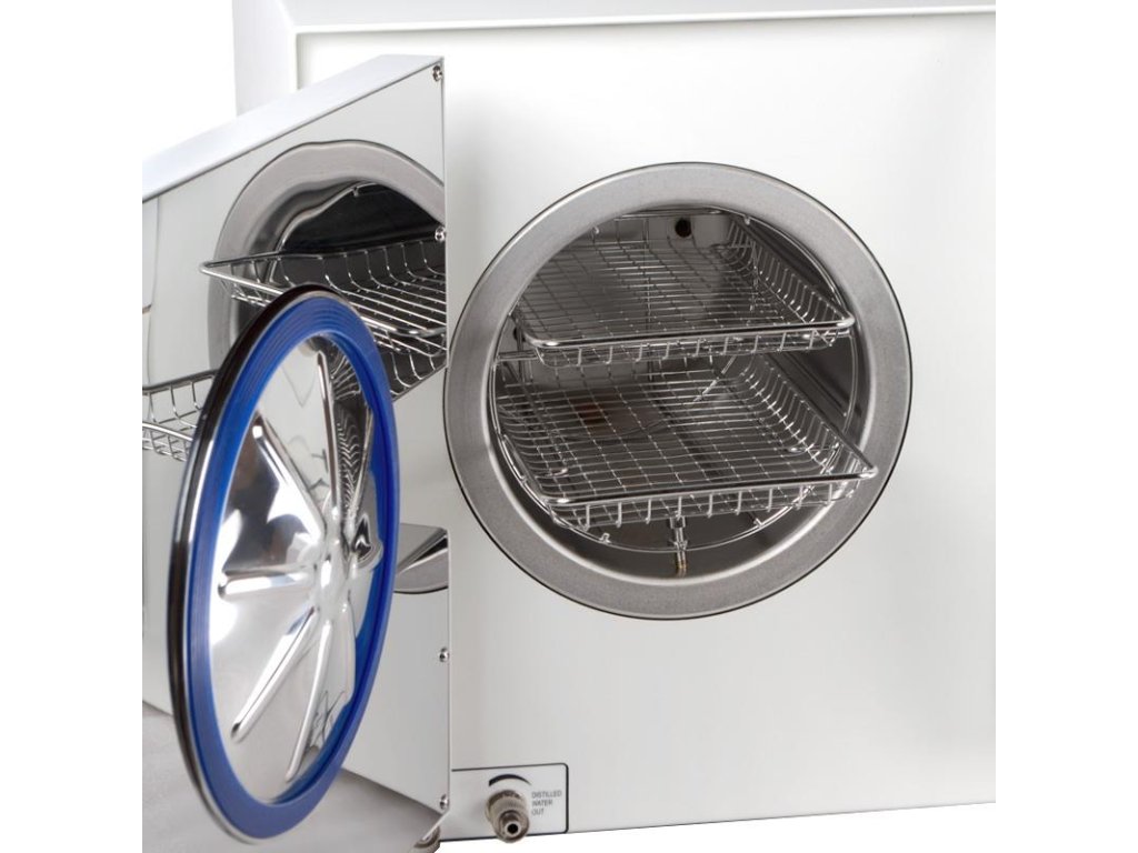 Technické údaje: Komora z kyselinovzdornej ocele (chromonikel), Elektronický zámok dverí, Pracovný čas - 20-45min v závislosti od programu, Vonkajšie rozmery: 50x44x40cm, Vnútorné rozmery: hĺbka: 29cm, pracovný priemer: 17cm, Objem: 8l, Hmotnosť: 3 , Rozmery balenia: 67x55x49, 5 cmHmotnosť s obalom: 46 kgNapájanie 220-230 V , 50/60 Hz , 1800 W, certifikát CE a smernice ES 93/42/EHS. Vyobrazený obrázok je iba ilustračný. Autokláv s objemom 8 l má vpredu pod dvierkami vývody čistej a odpadovej vody.