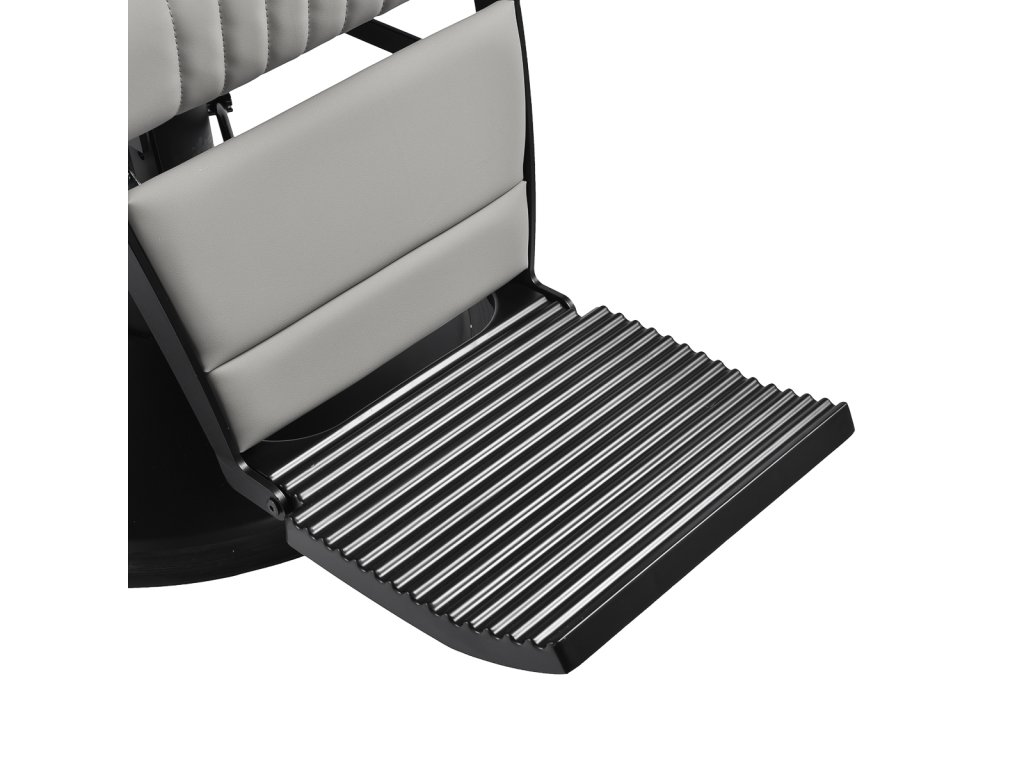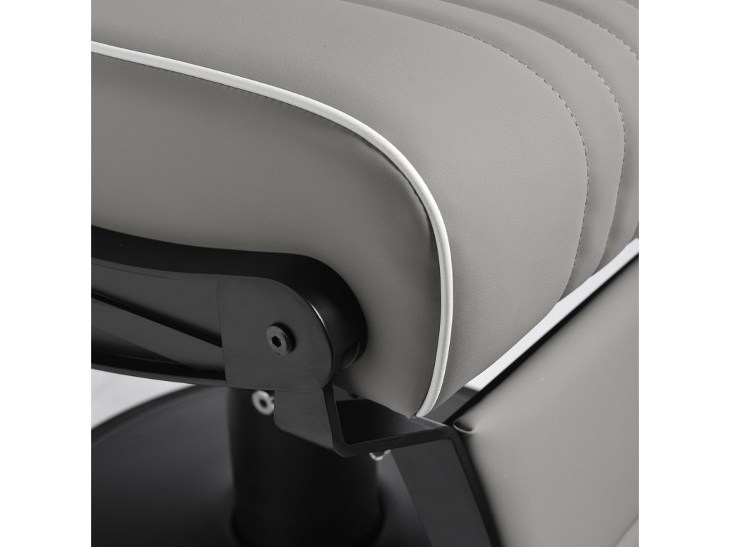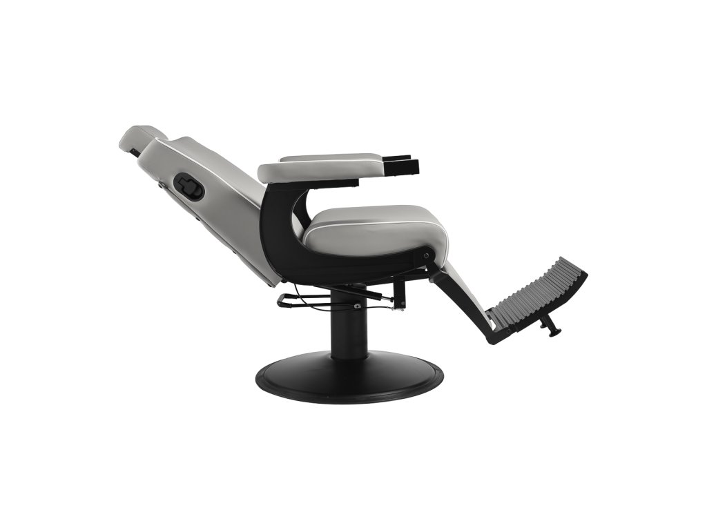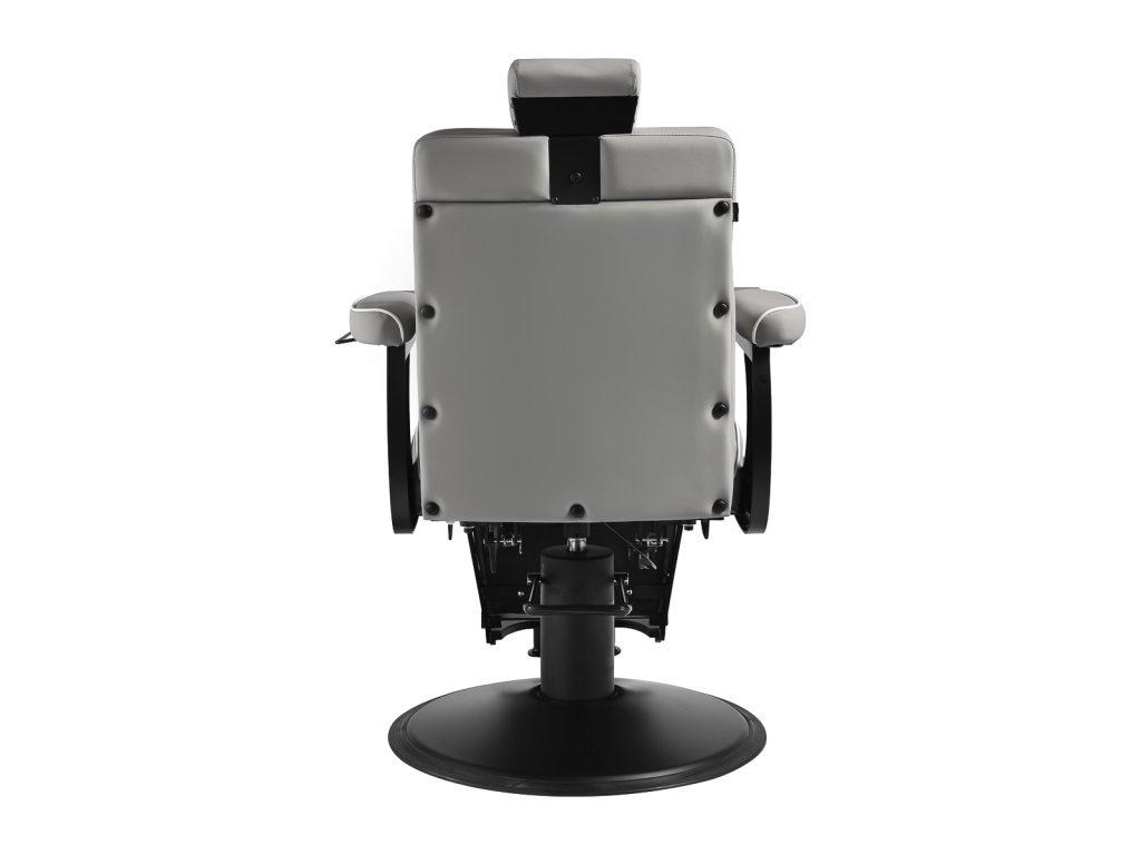 Konštrukcia kresla je vyrobená z odolnej ocele v čiernej farbe a stojí na stabilnej okrúhlej základni, ktorá zaisťuje pevnosť a dlhú životnosť. Čalúnenie z matnej syntetickej kože v elegantnom sivom odtieni je odolné voči vlhkosti a ľahko sa čistí, takže kreslo zostáva dlhodobo v skvelom stave. Spojenie sivej farby čalúnenia a čiernej konštrukcie dodáva kreslu moderný a profesionálny vzhľad, ktorý skvele zapadne do súčasných pánskych salónov.