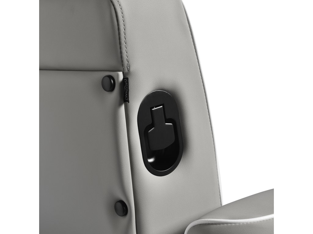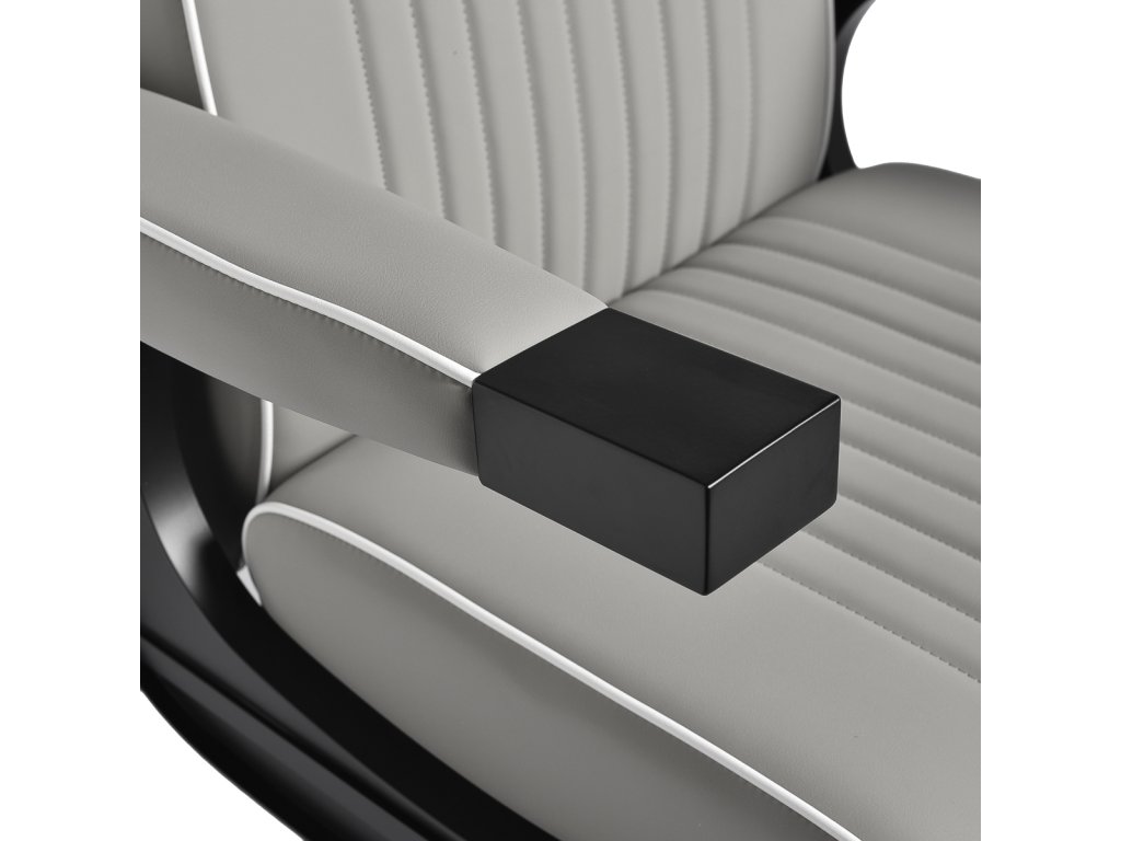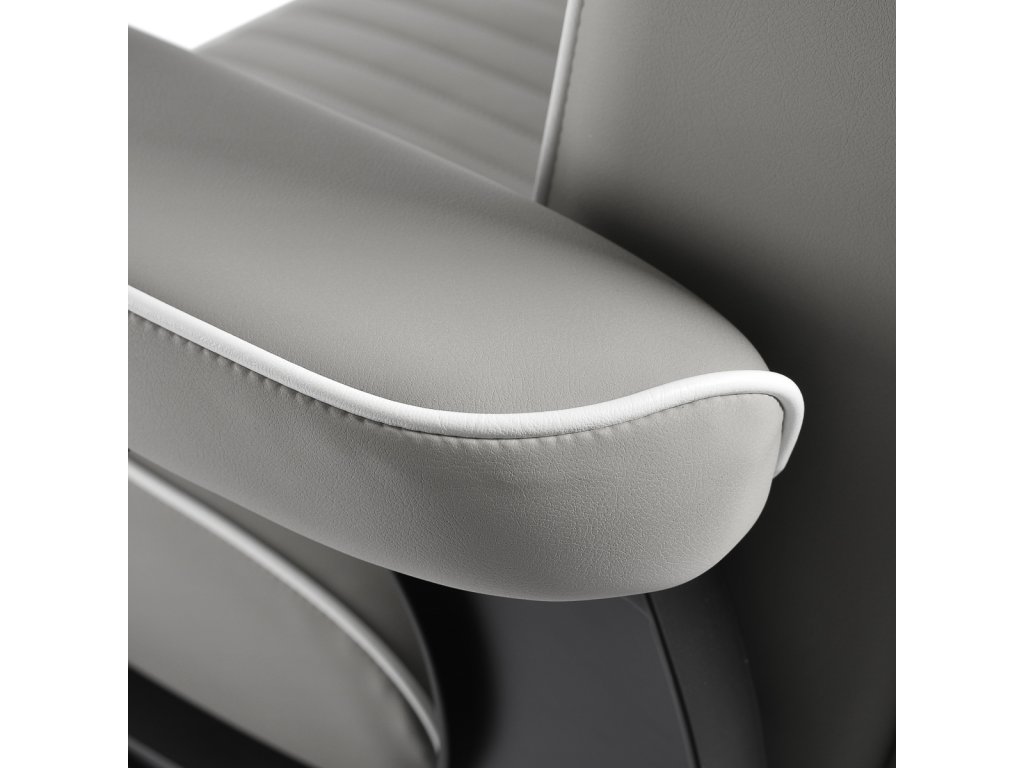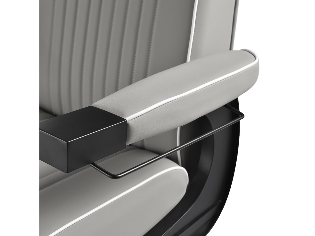 Konštrukcia kresla je vyrobená z odolnej ocele v čiernej farbe a stojí na stabilnej okrúhlej základni, ktorá zaisťuje pevnosť a dlhú životnosť. Čalúnenie z matnej syntetickej kože v elegantnom sivom odtieni je odolné voči vlhkosti a ľahko sa čistí, takže kreslo zostáva dlhodobo v skvelom stave. Spojenie sivej farby čalúnenia a čiernej konštrukcie dodáva kreslu moderný a profesionálny vzhľad, ktorý skvele zapadne do súčasných pánskych salónov.