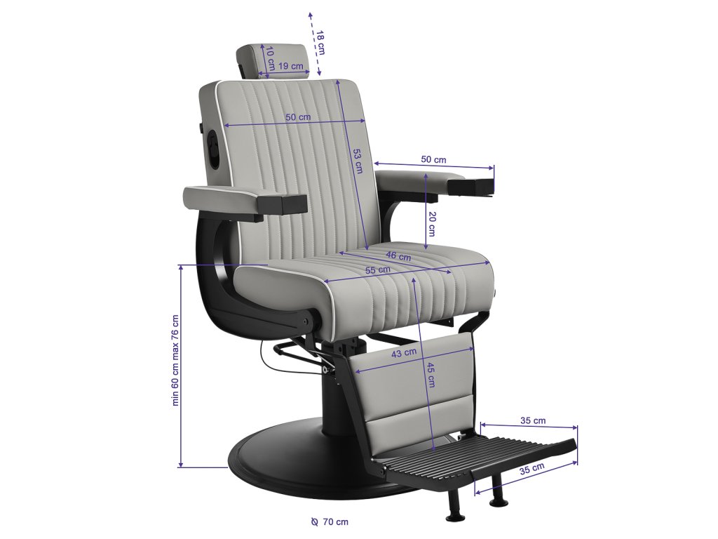 Barberské holičské kreslo Master je ideálnou voľbou pre moderné barber salóny, ktoré hľadajú kombináciu elegantného dizajnu, vysokého komfortu a špičkovej funkčnosti. Kreslo je vybavené výkonným hydraulickým zdvihom, vďaka ktorému možno jednoducho regulovať výšku sedadla v rozmedzí 60–76 cm aj s klientom na kresle. Polohovateľné operadlo, podnožka a výsuvný opierok hlavy umožňujú nastaviť ideálnu polohu pre každý typ ošetrenia, vrátane precíznych a časovo náročnejších služieb.