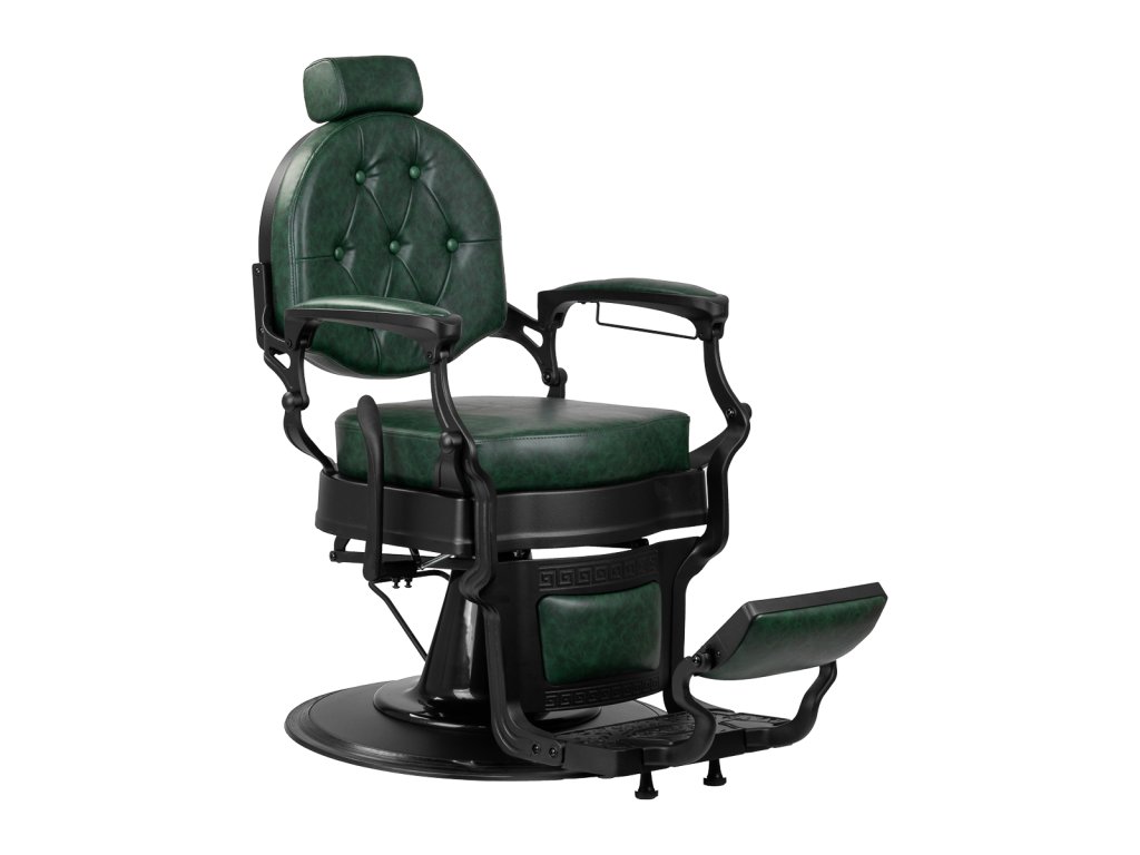 Zelený poťah s prešívaním a ozdobnými gombíkmi dodáva stoličke výrazný vintage charakter, ktorý dokonale dopĺňa atmosféru tradičného holičstva.