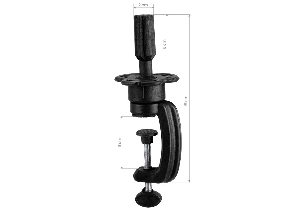 Vďaka svojmu minimalistickému dizajnu statív dokonale zapadne do interiéru každého kaderníckeho salónu alebo školiaceho priestoru. Ľahká, ale pevná konštrukcia z odolného plastu zaručuje mobilitu, trvanlivosť a odolnosť voči mechanickému poškodeniu. Vysokokvalitné materiály použité pri jeho výrobe zaručujú dlhú životnosť a ergonomický dizajn zvyšuje pohodlie pri práci. Statív je vybavený zverákom s maximálnym otvorením 4,5 cm, ktorý umožňuje jednoduché a stabilné upevnenie na väčšinu stolových dosiek.