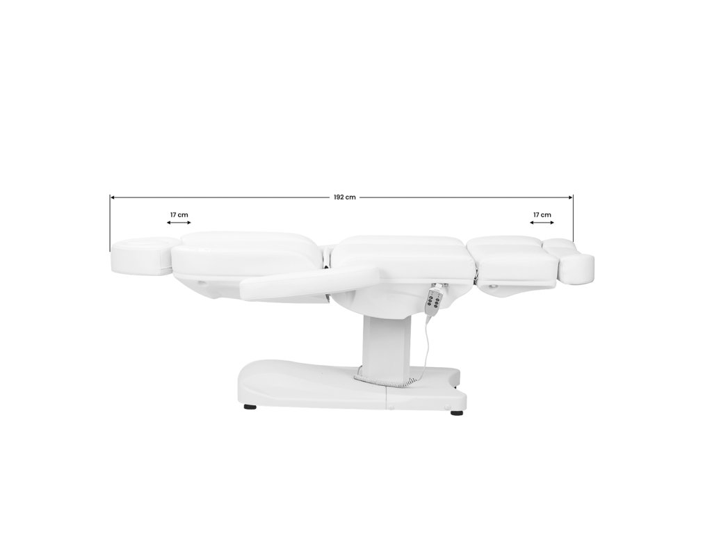 Lehátko je vybavené tromi výkonnými elektrickými motormi, ktoré umožňujú plynulé a tiché nastavenie výšky, sklonu operadla a polohy podnožky. Výškový rozsah 64–90 cm zabezpečuje ergonomickú pracovnú pozíciu pre obsluhu a znižuje zaťaženie chrbta aj pri dlhodobých procedúrach. Pri úplnom rozložení dosahuje lehátko dĺžku viac ako 2 metre, čo zaručuje maximálne pohodlie klienta pri telových ošetreniach aj masážach.