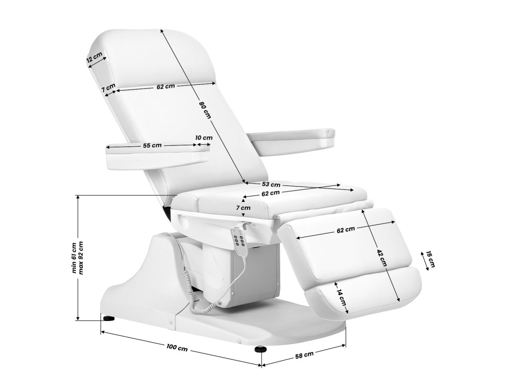 Výška sedadla je nastaviteľná od 61 cm do 92 cm a v úplne rozloženom stave dosahuje stolička dĺžku 190 cm. Tieto rozmery umožňujú jednoduché ovládanie zariadenia ľuďmi rôznej výšky a umožňujú jeho prispôsobenie potrebám klienta a osoby vykonávajúcej zákrok. Rukoväte na oboch stranách kresla umožňujú voľné zavesenie diaľkového ovládania, aby bolo vždy po ruke.
