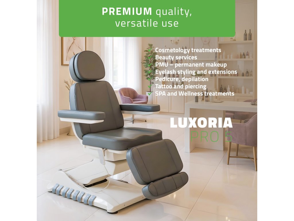 Kozmetické lehátko Elegance 5 spája technickú sofistikovanosť, komfort a štýlový dizajn – ideálna voľba pre každého, kto chce svojim klientom ponúknuť prvotriedny zážitok.