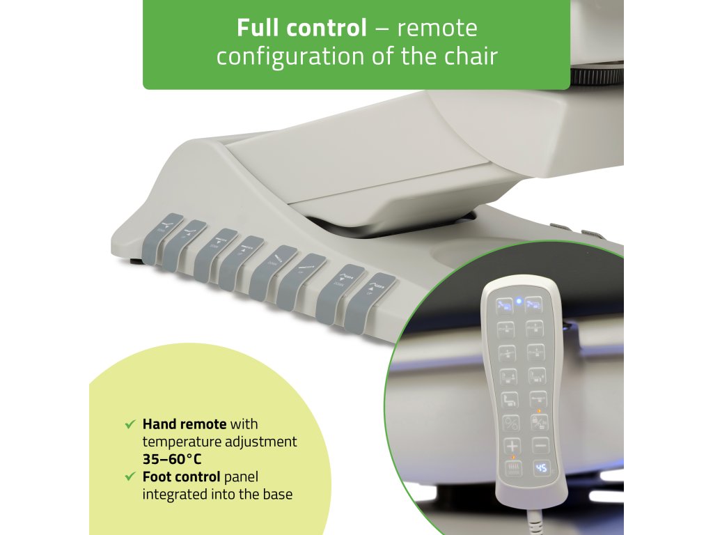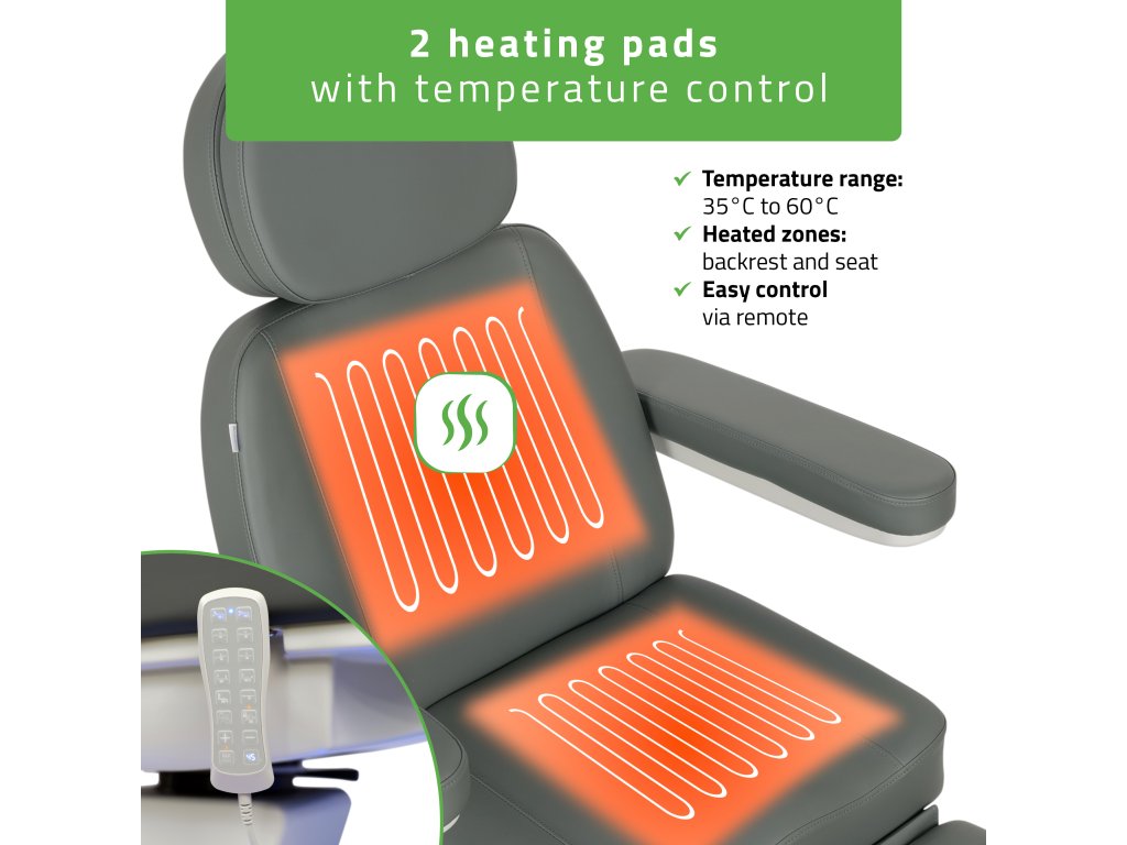 - Kúrenie s diaľkovým ovládaním – nastaviteľná teplota od 35 °C do 60 °C pre maximálny komfort počas procedúr.