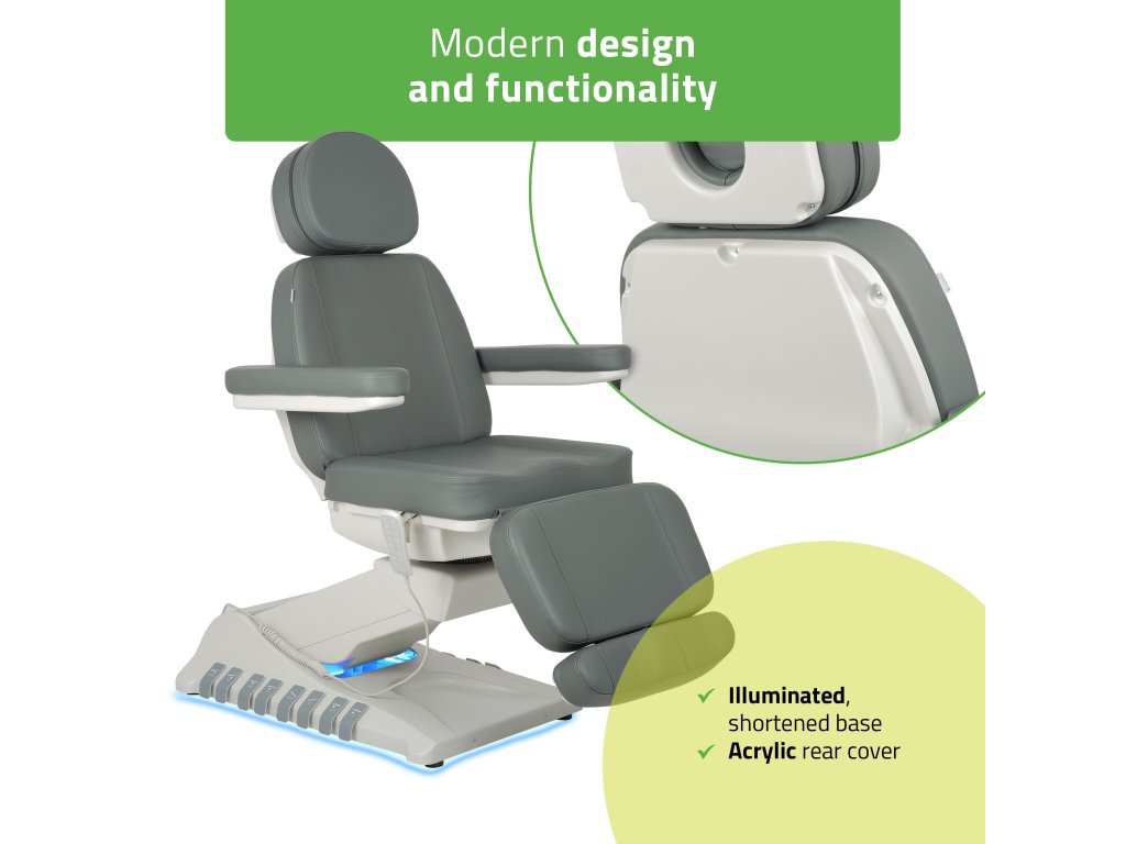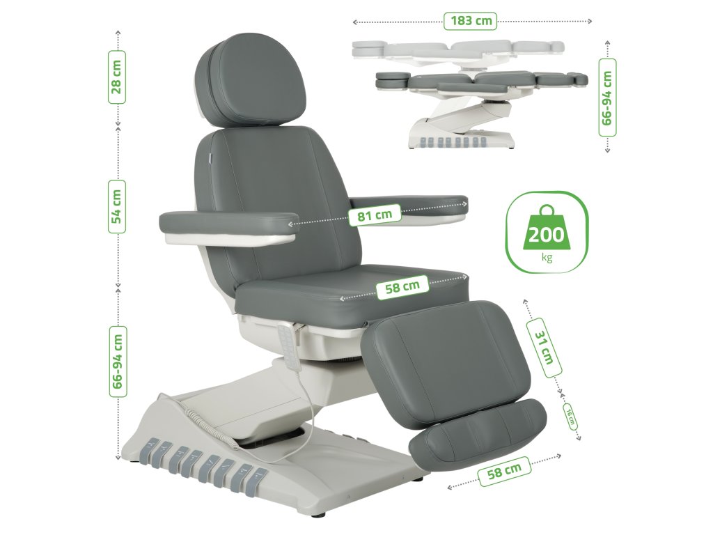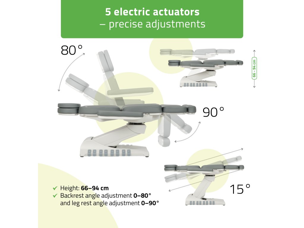 Kozmetické lehátko Elegance 5 je špičkové kozmetické kreslo s 5 motormi určené na profesionálne použitie v kozmetických salónoch, klinikách estetickej medicíny a wellness centrách. Vďaka samostatným motorom umožňuje jednoduché a plynulé nastavenie do všetkých potrebných polôh a poskytuje maximálny komfort pre klienta a pohodlnú prácu pre obsluhu.