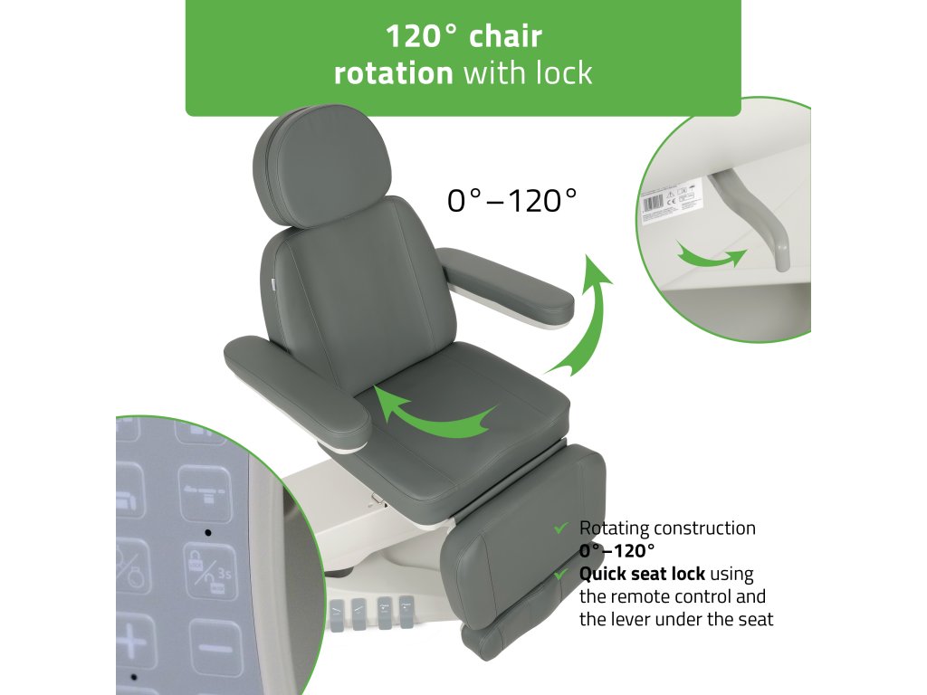 - Elektrické ovládanie s 5 motormi – samostatné motory umožňujú nastavenie výšky (60–90 cm), uhla operadla (0–80°), opierky nôh (0–90°), sklonu celého kresla a otočnej základne s rozsahom 120°.