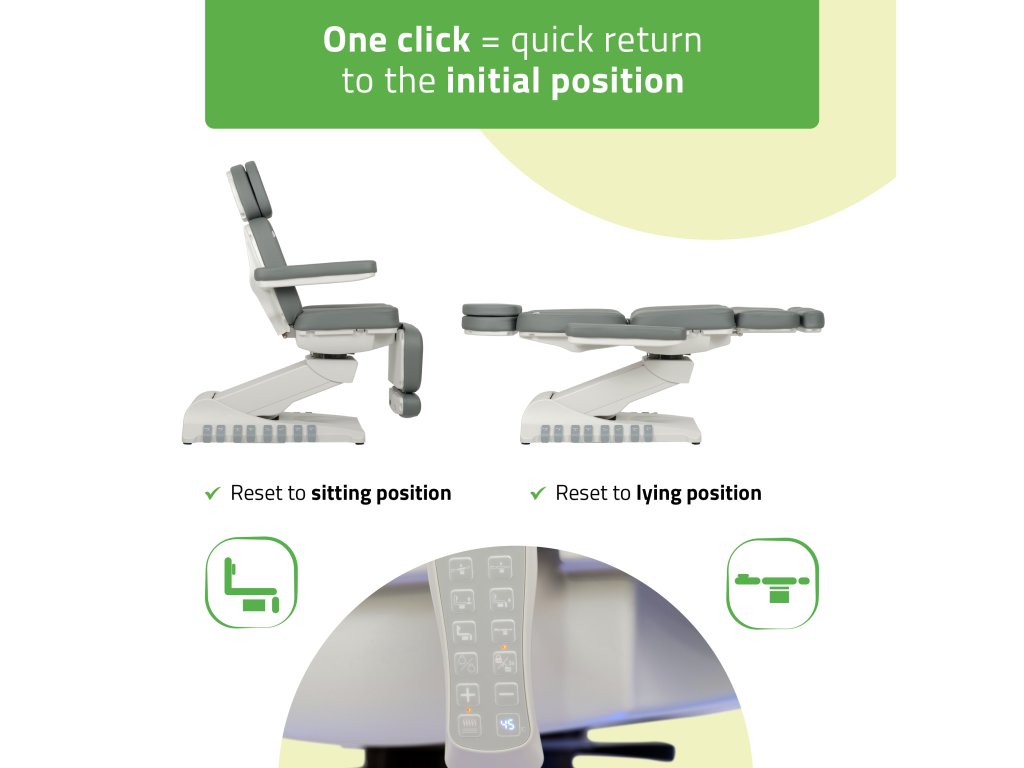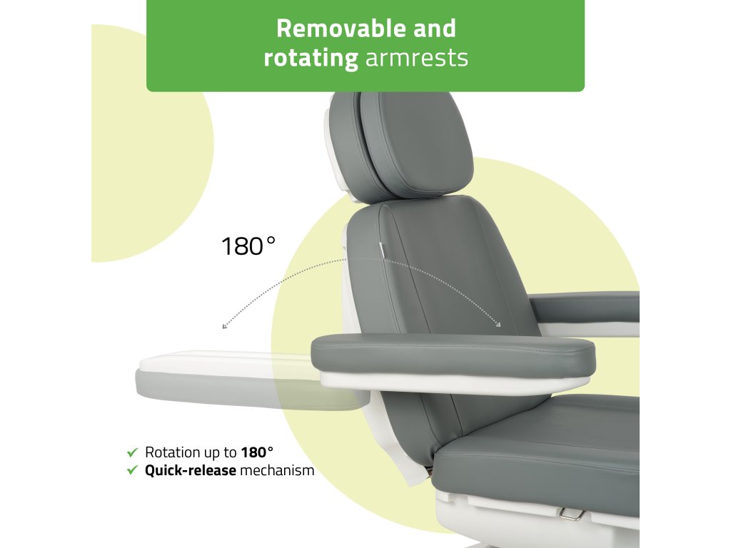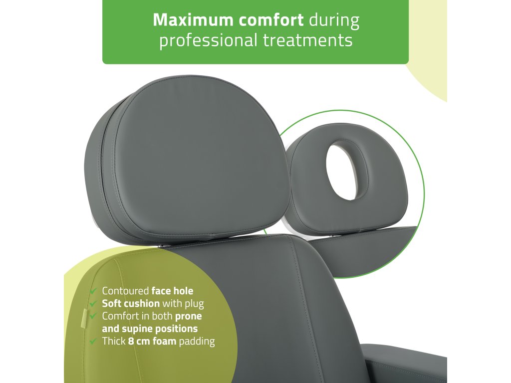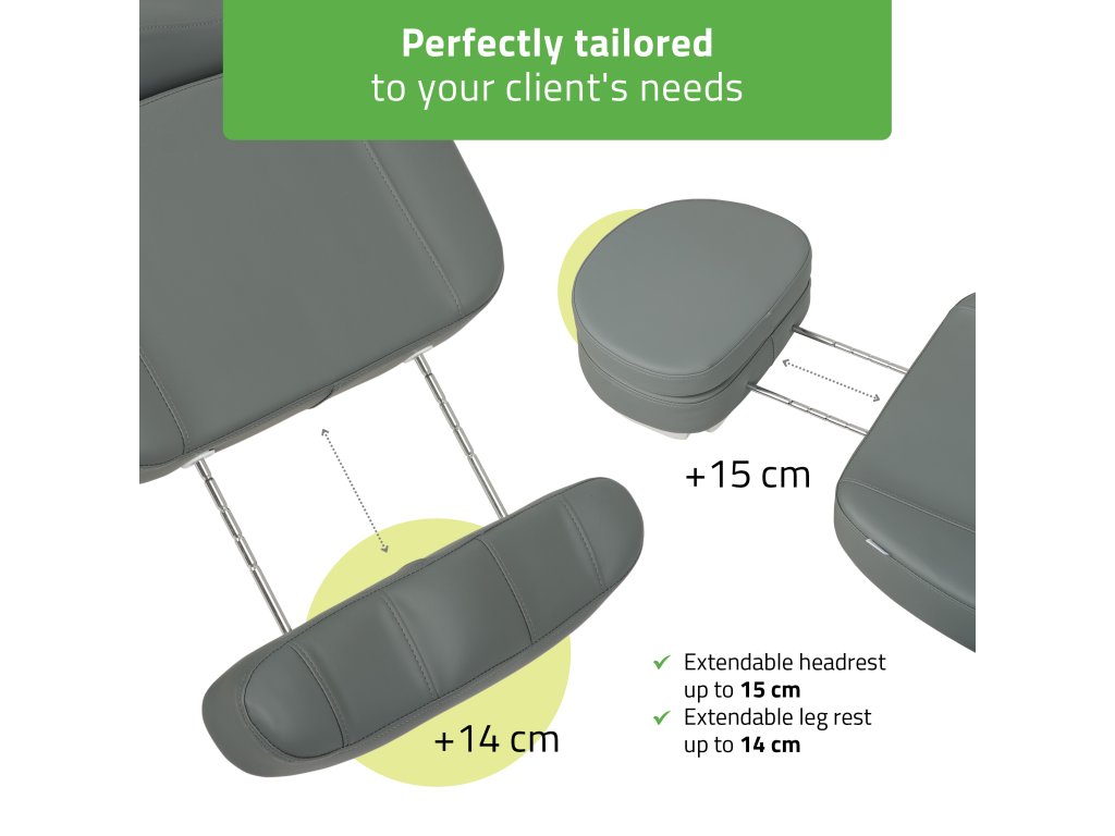 - Pohodlie pre klienta – odnímateľné a otočné podrúčky, otvor na tvár s vankúšikom, výsuvná opierka hlavy (o 15 cm) a opierka nôh (o 14 cm).