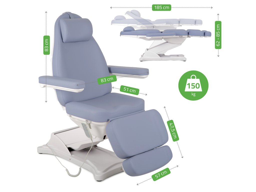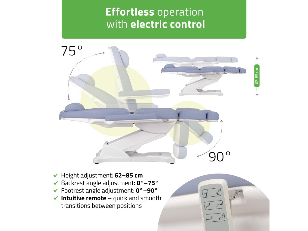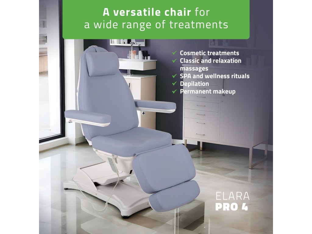 Simply Elegance PRO 4 je elektrické kozmetické kreslo PREMIUM triedy, ideálne pre profesionálne salóny, estetické kliniky, masážne a wellness centrá. Vďaka elektrickému nastaveniu v troch rovinách (výška, sklon operadla, uhol nožnej časti) poskytuje maximálnu flexibilitu a pohodlie pre klienta aj terapeuta.