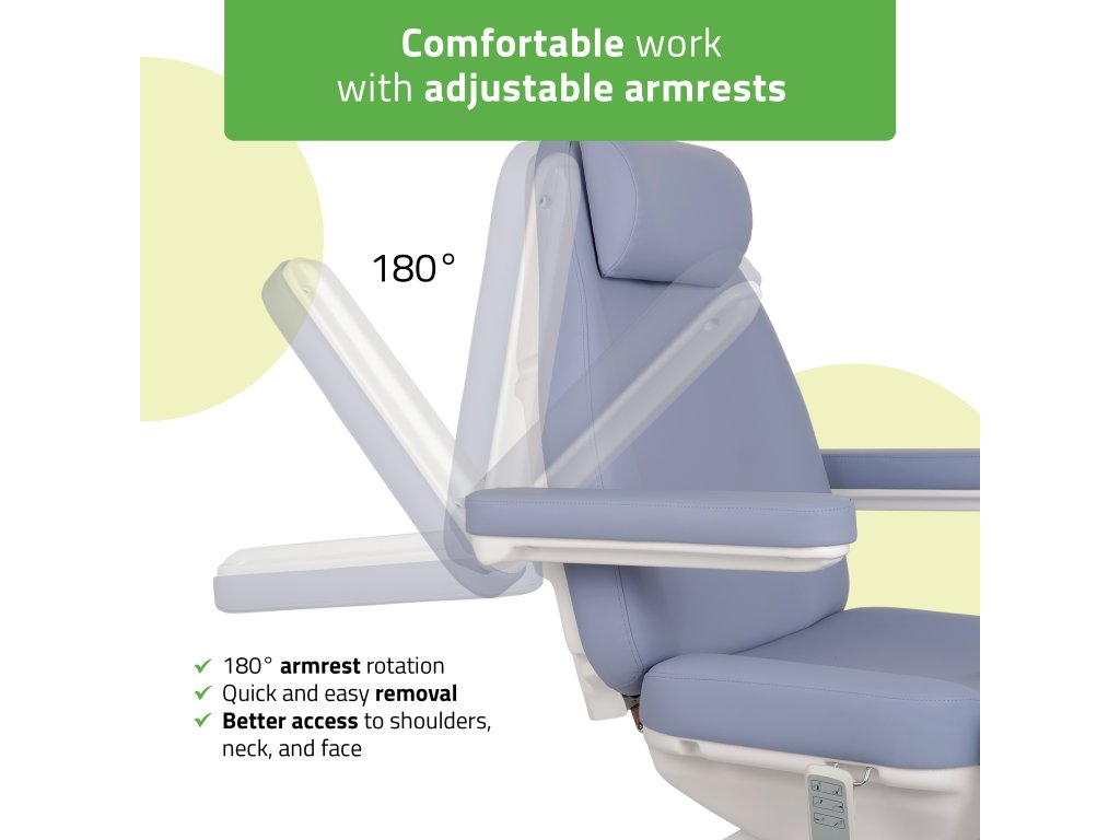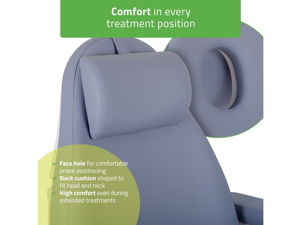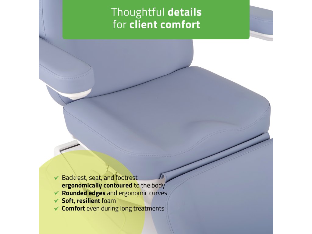 Pohodlné a ergonomicky tvarované sedadlo, operadlo aj nožná časť majú zaoblené hrany a mäkké polstrovanie pre optimálnu oporu tela. Lehacia poloha s otvorom na tvár a mäkkým krčným vankúšom zaručuje maximálne uvoľnenie počas ošetrení v ľahu na bruchu. Podrúčky je možné ľahko odňať a otočiť podľa potreby. Vďaka vysúvateľnej opierke nôh (až o 12 cm) možno kreslo prispôsobiť individuálnej výške klienta.