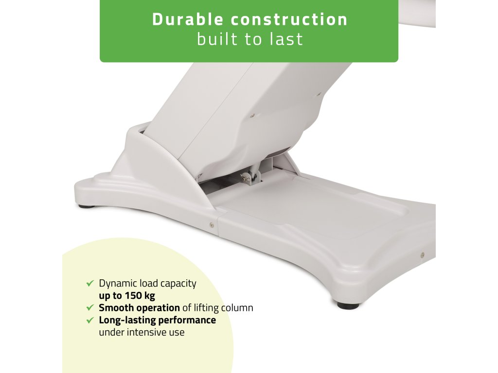 Zúžená a spevnená základňa umožňuje pohodlný prístup k hlavovej časti a zároveň poskytuje dostatok miesta pre nohy terapeuta. Nosnosť až 150 kg garantuje bezpečnosť a stabilitu aj pri intenzívnom používaní. Elegantný moderný plášť a jemné svetlofialové čalúnenie dodajú každému interiéru profesionálny a sofistikovaný vzhľad.