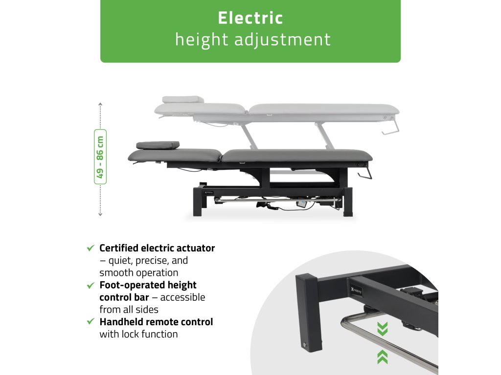 Lehátko je vybavené tichým elektrickým motorom, ktorý umožňuje plynulé nastavenie výšky od 49 do 86 cm. Ovládanie prebieha pomocou ručného ovládača so zámkom výšky a nožného rámu po oboch stranách, vďaka čomu je možné výšku meniť bez prerušenia terapie.