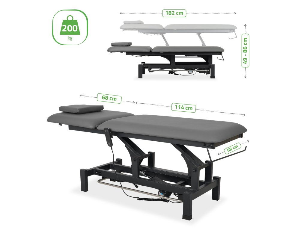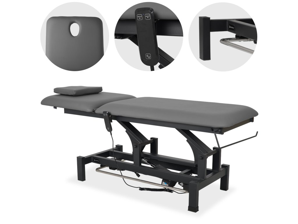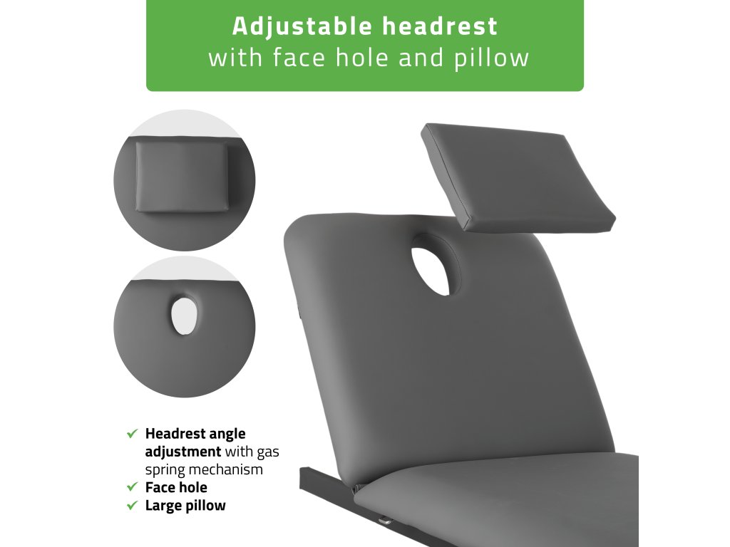 Dvojdielna pracovná plocha s rozmermi 182 × 68 cm poskytuje optimálnu oporu pre celé telo. Nastaviteľné operadlo s plynovou pružinou zaručuje tichý a plynulý pohyb a jednoduché prispôsobenie podľa typu ošetrenia. Integrovaný otvor na tvár umožňuje voľné dýchanie pri polohe na bruchu a súčasťou je aj mäkký vankúš, ktorý otvor prekryje počas procedúr v polohe na chrbte.