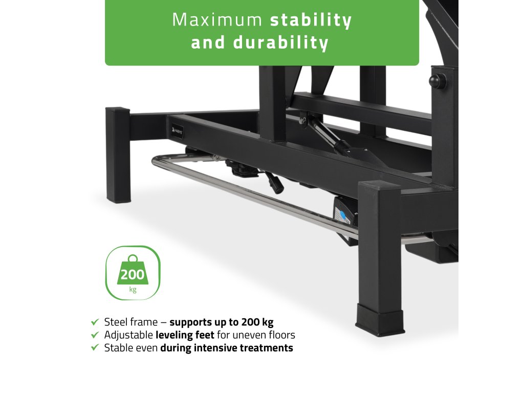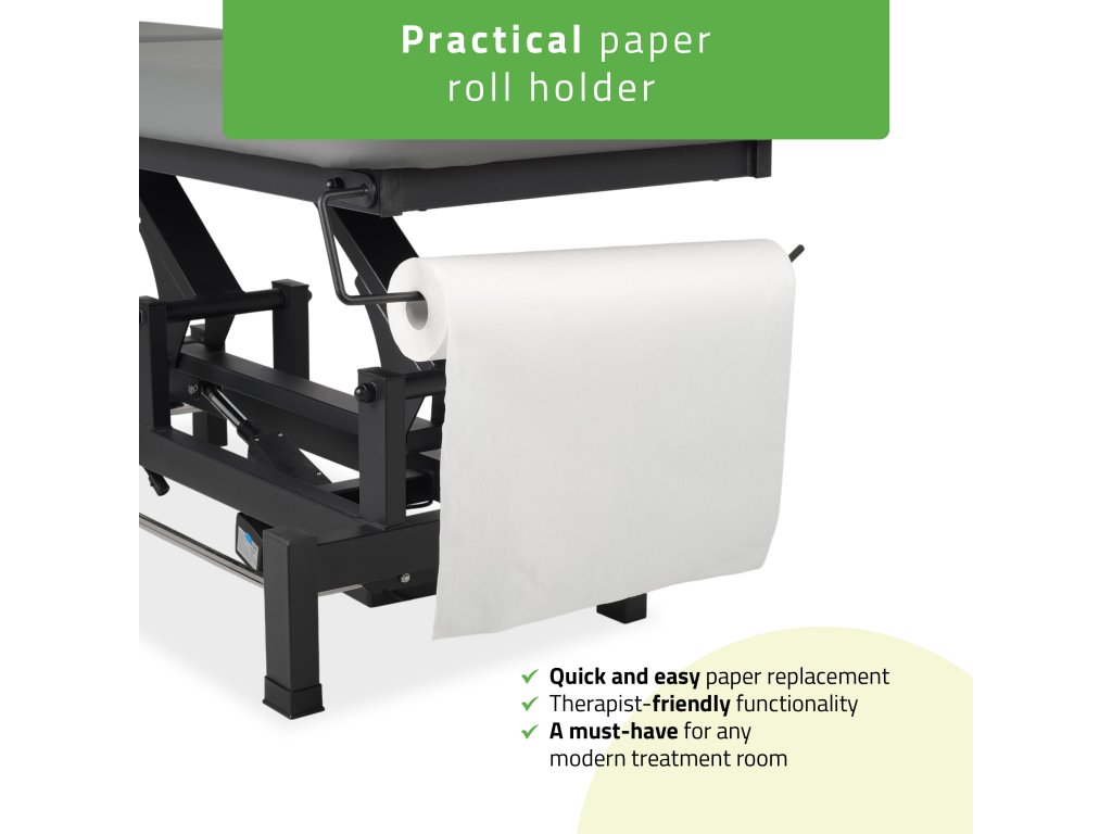 Stabilná kovová konštrukcia s nosnosťou 200 kg zabezpečuje maximálnu bezpečnosť a odolnosť pri každodennom používaní. Držiak papierovej rolky zvyšuje hygienu a uľahčuje prácu terapeuta.