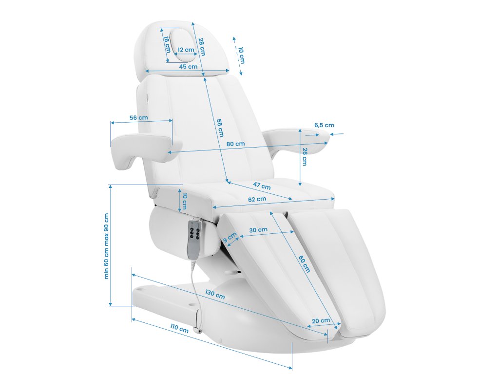 Rozsah výšky od približne 60 do 90 cm umožňuje ergonomickú prácu v sede aj v stoji. V plne rozloženej polohe má kreslo dĺžku okolo 200 cm, čo poskytuje dostatok priestoru a komfortnú oporu celého tela – ideálne na ošetrenia v ľahu.