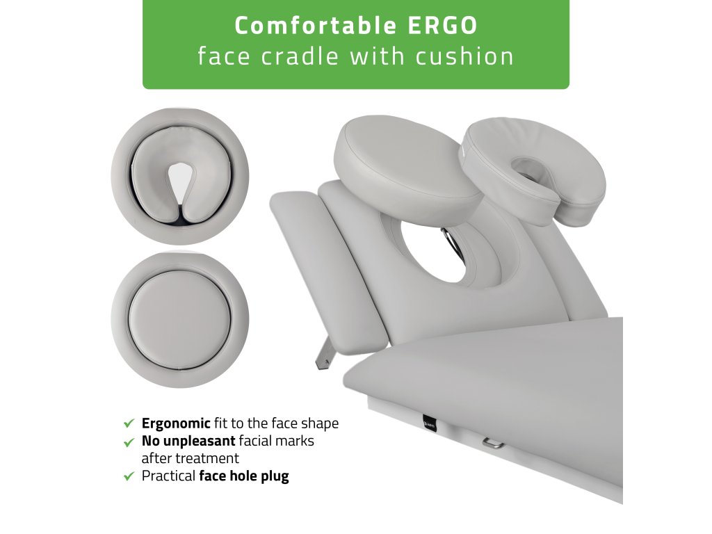 Stredová časť lehátka má nastaviteľný zlom v rozsahu 0°–25°, čo umožňuje ideálne nastavenie pri ošetreniach zameraných na bedrovú a panvovú oblasť. Ergonomický vankúš ERGO s otvorom na tvár zaručuje komfort aj pri dlhších terapiách a možno ho jednoducho uzavrieť záslepkou.