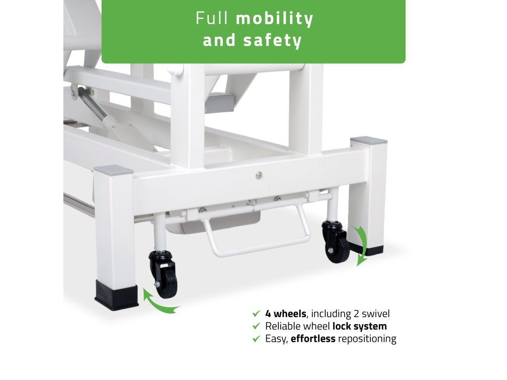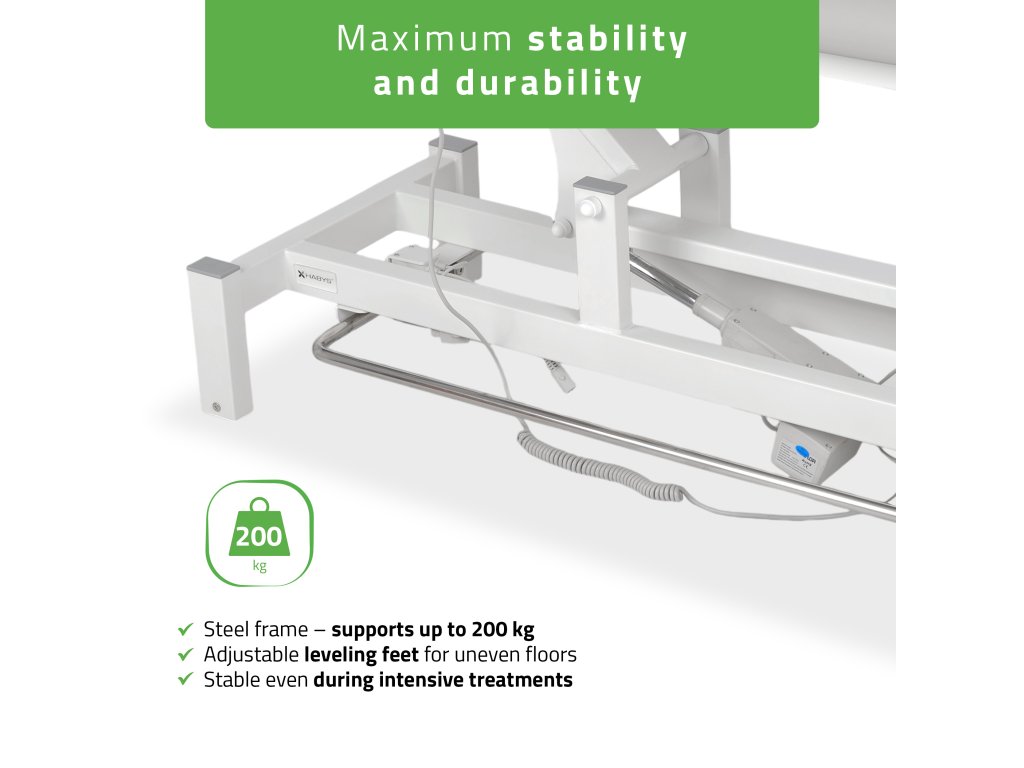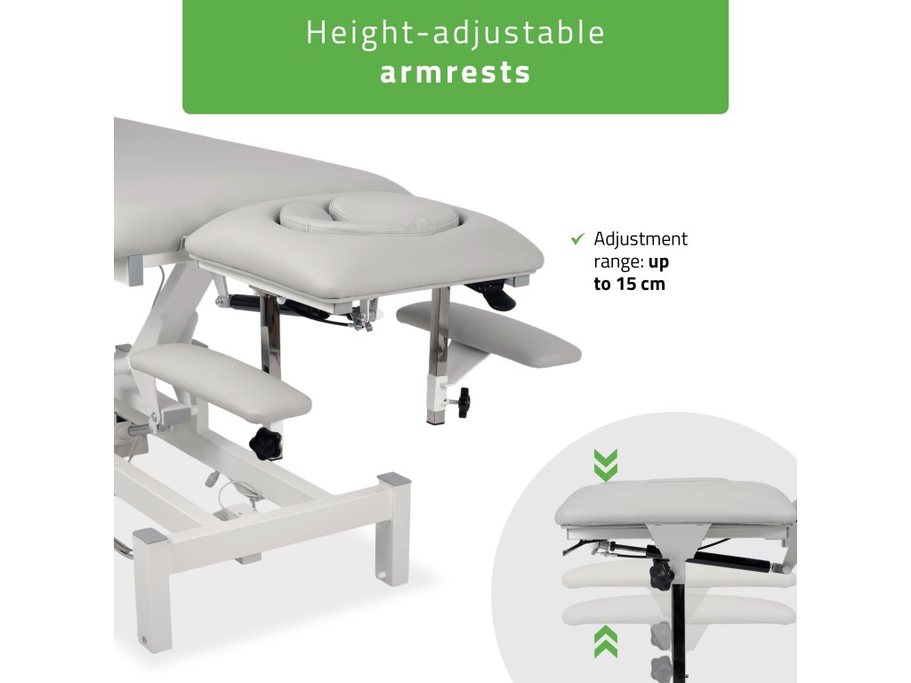 Lehátko disponuje tichým elektrickým pohonom s výškovým rozsahom 49–86 cm, ktorý umožňuje jednoduché prispôsobenie pracovnej výšky. Ovládanie prebieha prostredníctvom ručného ovládača s funkciou zámku alebo nožnej ovládacej lišty po obvode rámu, takže polohu je možné meniť aj počas terapie bez prerušenia práce.