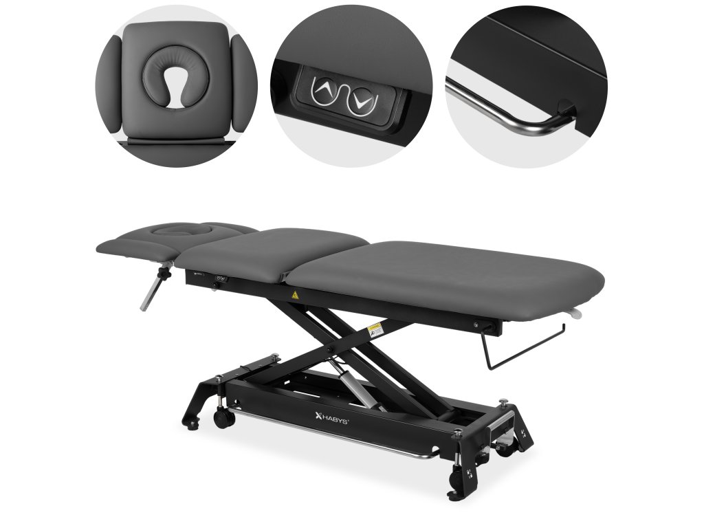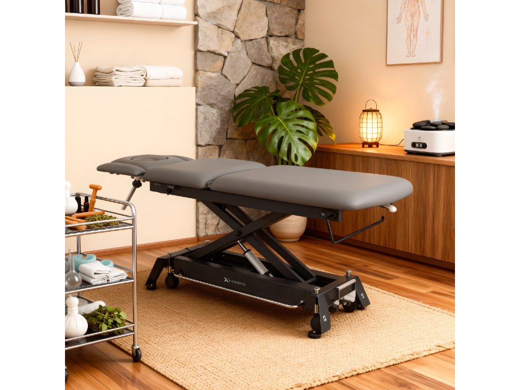 Výškový zdvih v rozsahu 36–85 cm je tichý, plynulý a rýchly. Nižšia pozícia umožňuje bezpečný nástup klienta, vyššia uľahčuje prácu terapeuta pri technikách, ktoré vyžadujú silu či presný tlak.