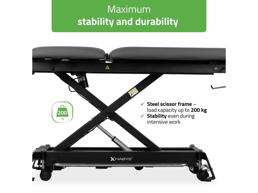 Oceľová nožnicová základňa zabezpečuje mimoriadnu stabilitu a nosnosť až 200 kg, čo zaručuje bezpečné používanie pre širokú škálu klientov aj intenzívne techniky.