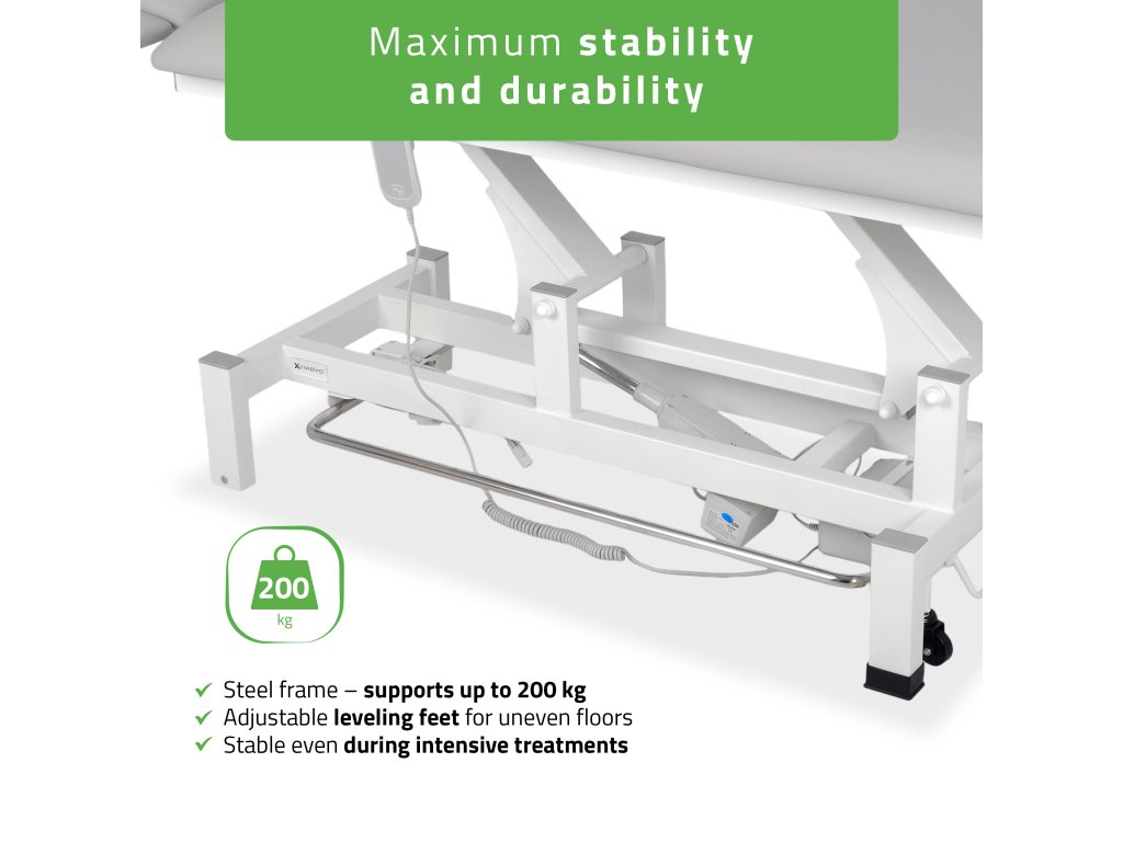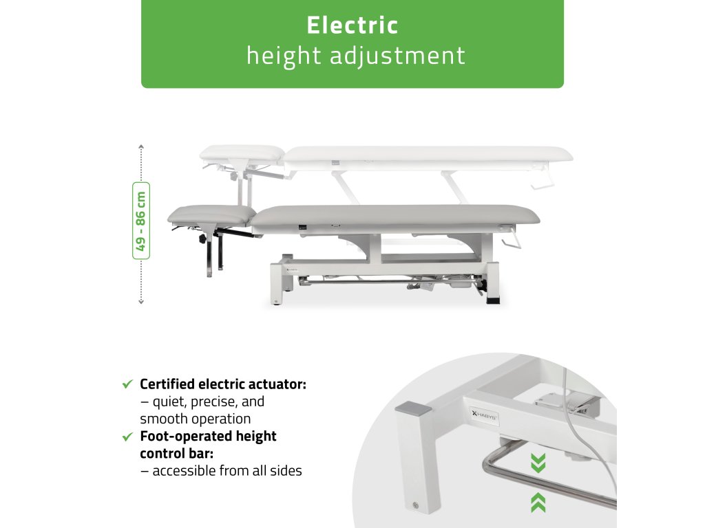 Lehátko je vybavené tichým elektrickým zdvihom v rozsahu 49–86 cm, ktorý možno pohodlne ovládať ručným ovládačom s blokáciou alebo nožným rámom po oboch stranách konštrukcie. To umožňuje plynulé a bezpečné nastavenie výšky bez prerušenia terapie.