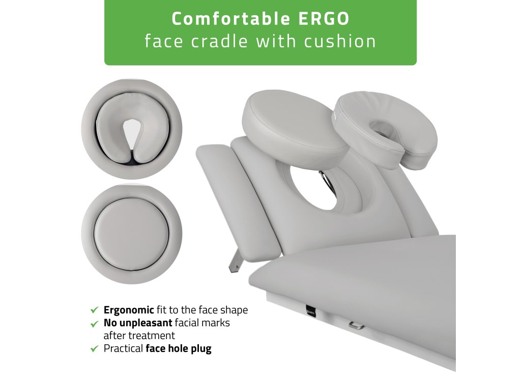 Ergonomická hlavová časť s plynovou pružinou a tvarovaným ERGO vankúšom poskytuje maximálne pohodlie klientovi aj počas dlhších procedúr. Súčasťou je aj odnímateľná záslepka otvoru na tvár, vďaka ktorej možno rýchlo prispôsobiť polohu pacienta.