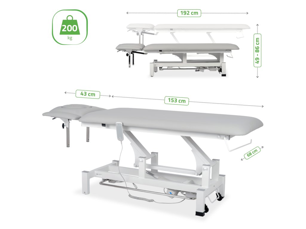 Ložná plocha je rozdelená na 4 nastaviteľné sekcie s rozmerom 192 × 68 cm. 7 cm silná pena s univerzálnou tvrdosťou zaručuje optimálnu oporu pre rôzne typy terapií. Odolné PVC čalúnenie Satin Comfort je príjemné na dotyk, jednoducho sa čistí a odoláva olejom aj dezinfekčným prostriedkom.