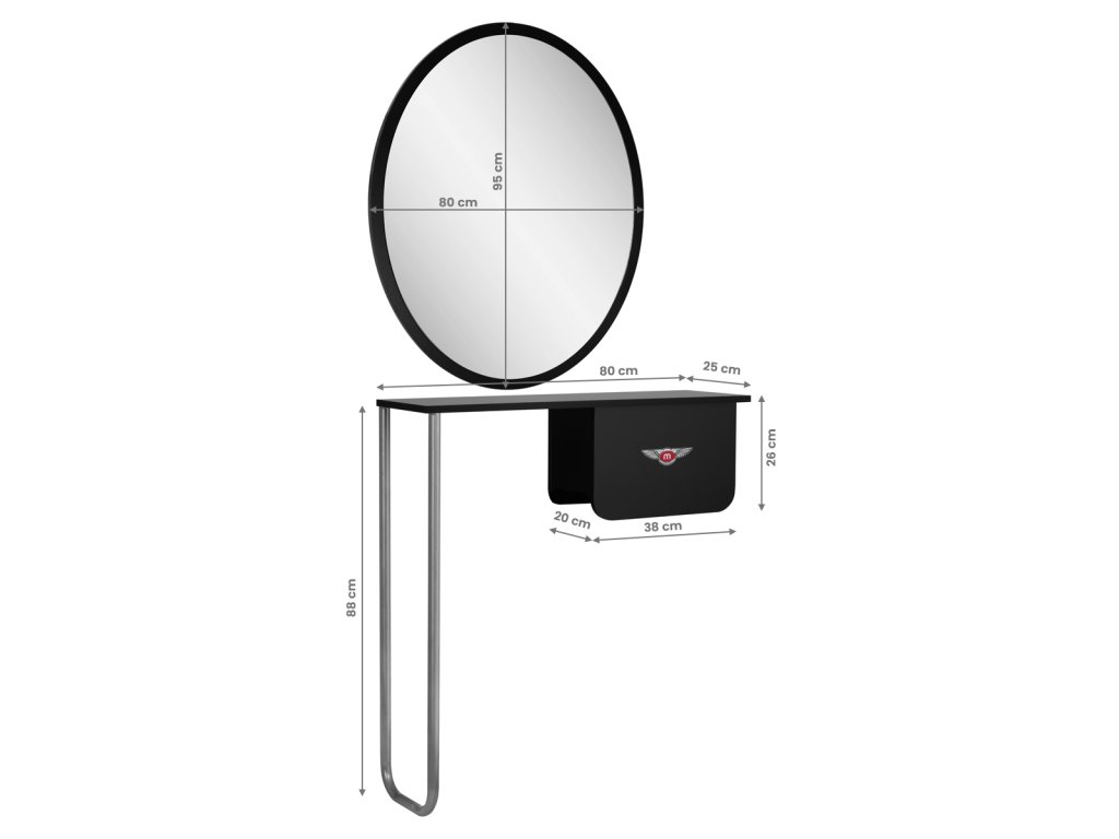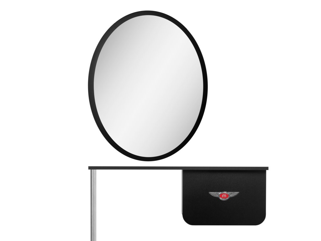 Klasická holičská konzola s oválnym zrkadlom a šikovnou policou so zásuvkou. Prvotriedne prevedenie. Elegantný a zároveň univerzálny prvok interiéru, ktorý podčiarkne charakter každého BARBER SALONU