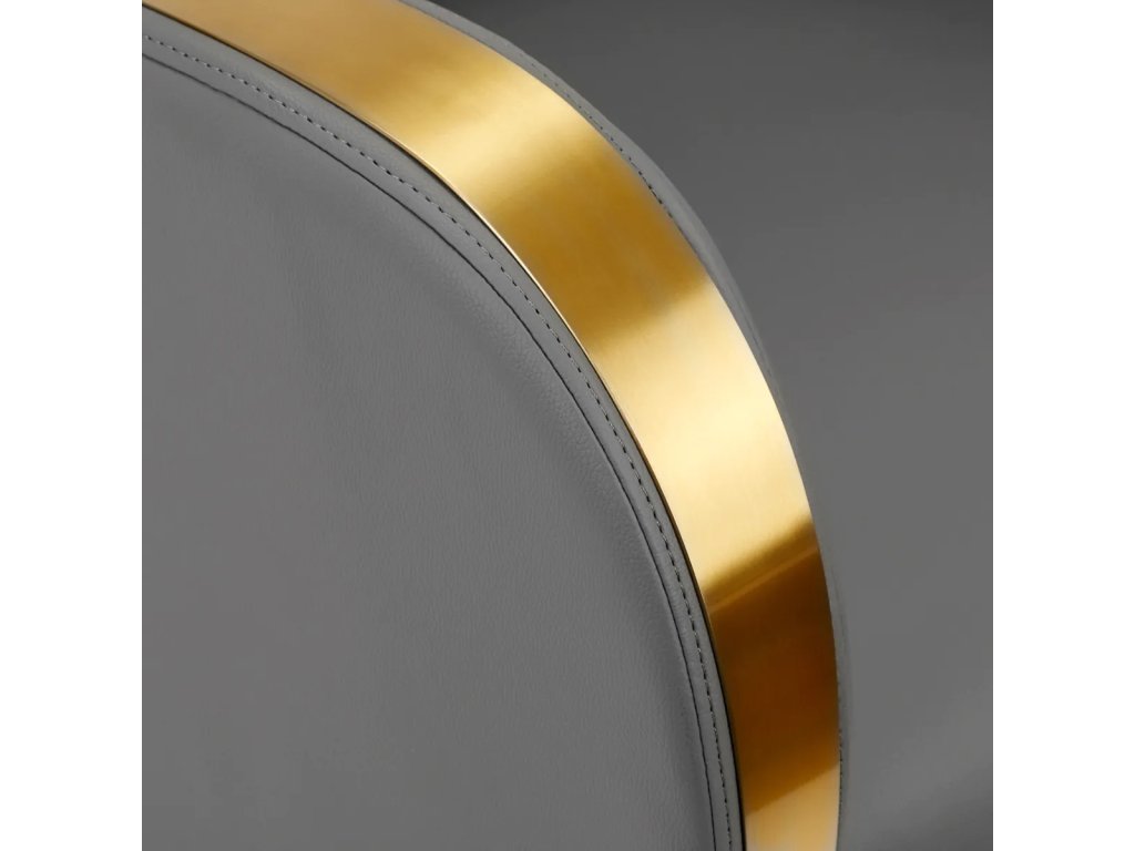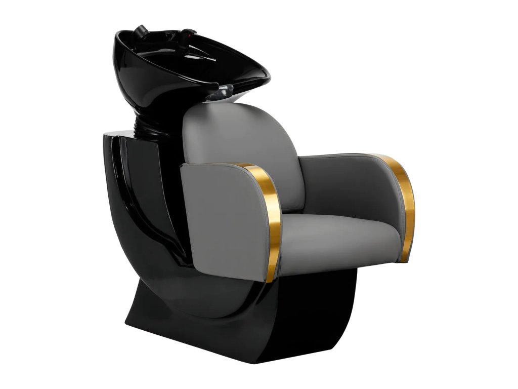 Vhodne tvarované kreslo vyplnené odolnou penou zaručuje vysoký komfort používania, zatiaľ čo elegantné podrúčky umožňujú správne polohovanie ramien klienta. Operadlo umiestnené v optimálnom uhle umožňuje zaujať správnu polohu a podporuje vynikajúcu podporu chrbtice. Poťah v sivom odtieni a ozdobné zlaté lakované kovové povrchy mu dodávajú výraz nadčasovej elegancie a zároveň zaručujú dlhoročnú životnosť a jednoduché čistenie. Výrazné klasické vyhotovenie umývadla znamená, že bude vyzerať skvele takmer v každom priestore. Súčasťou balenia je kompletné príslušenstvo v odtieňoch čiernej farby vrátane batérie, sprchovej rukoväte a vyhradených hadíc, ktoré zabezpečia kompletnú sadu nástrojov na prácu.
