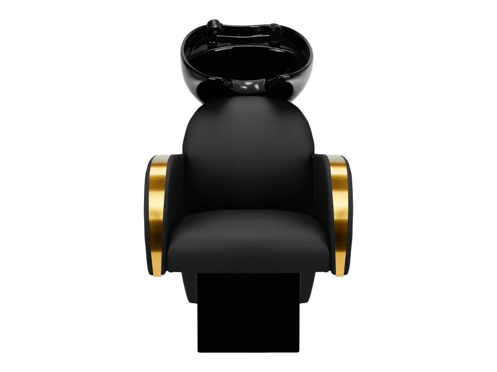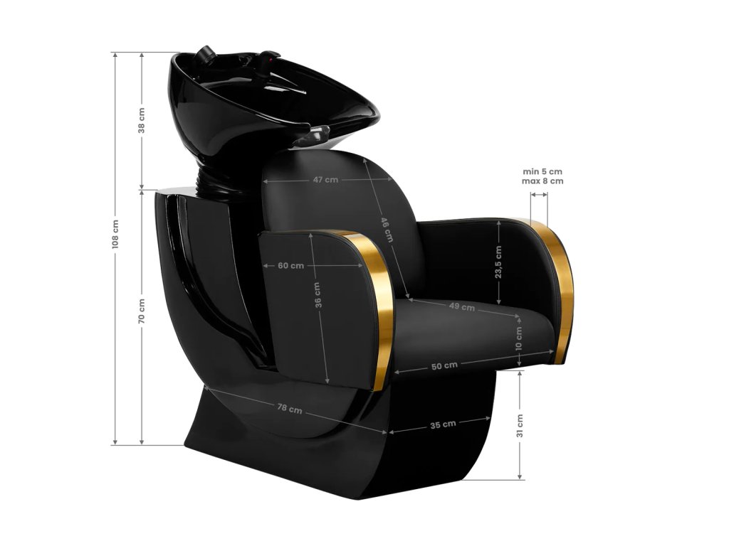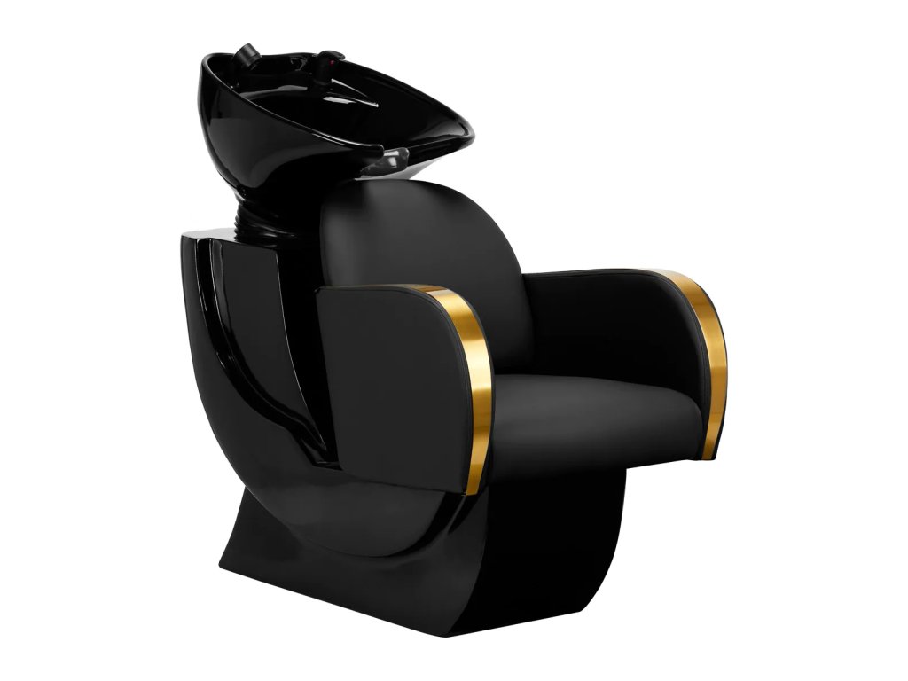 Vhodne tvarované kreslo vyplnené odolnou penou zaručuje vysoký komfort používania, zatiaľ čo elegantné podrúčky umožňujú správne polohovanie ramien klienta. Operadlo umiestnené v optimálnom uhle umožňuje zaujať správnu polohu a podporuje vynikajúcu podporu chrbtice. Čierny poťah a ozdobné zlaté lakované kovové povrchy mu dodávajú výraz nadčasovej elegancie a zároveň zaručujú dlhoročnú životnosť a jednoduché čistenie. Výrazné klasické vyhotovenie umývadla znamená, že bude vyzerať skvele takmer v každom priestore. Súčasťou balenia je kompletné príslušenstvo v odtieňoch čiernej farby vrátane batérie, sprchovej rukoväte a vyhradených hadíc, ktoré zabezpečia kompletnú sadu nástrojov na prácu.