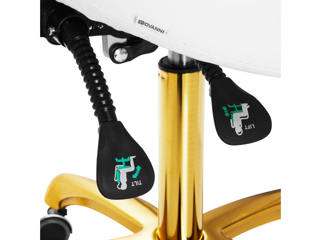 Vďaka päťramennej, dobre navrhnutej základni v zlatých odtieňoch je stolička stabilná aj pri intenzívnej práci. Kolieska zabezpečujú značnú mobilitu, čo uľahčuje premiestňovanie nábytku po kancelárii. Čalúnenie odolnej stoličky je vyrobené z imitácie kože v odtieňoch bielej farby. Vďaka použitiu takéhoto materiálu je stolička odolná voči vlhkosti a ľahko sa čistí.