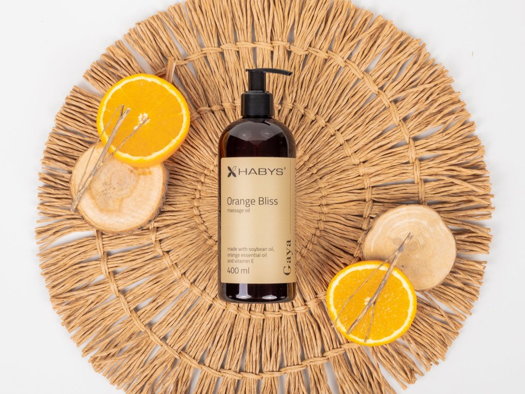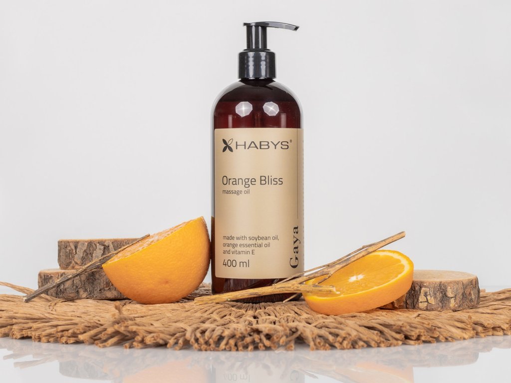Habys GAYA Masážny olej Orange Bliss 400 ml je ľahký aromatický olej vytvorený na báze prírodného sójového oleja, obohatený o esenciálny pomarančový olej a vitamín E. Tento olej je bohatým zdrojom polynenasýtených mastných kyselín, flavonoidov, lecitínu a antioxidantov, ktoré hydratujú, regenerujú a chránia pokožku.