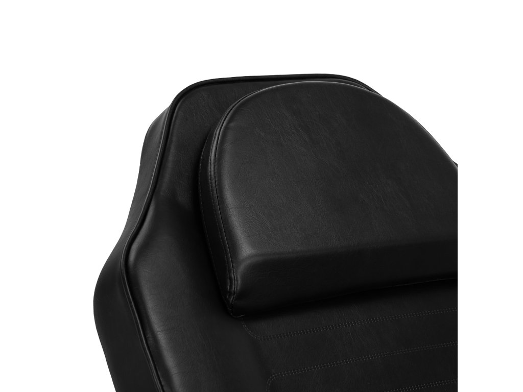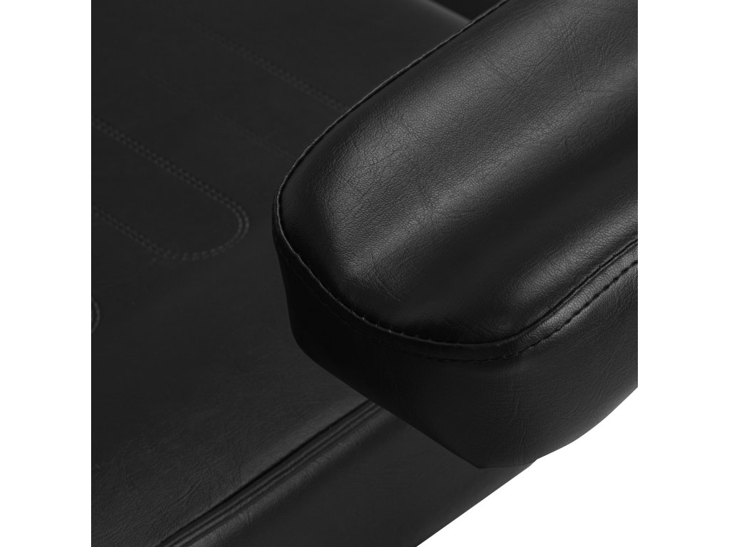 Pohodlie klienta zaisťuje vysoko kvalitné penové čalúnenie s optimálnou hustotou, ktoré zachováva pohodlie aj počas niekoľkohodinových sedení. Čalúnenie z čiernej syntetickej kože s polomatným povrchom je odolné voči vlhkosti a ľahko sa čistí, čo je kľúčové pre hygienu v profesionálnom štúdiu. Dekoratívne prešívanie na sedadle a opierke nôh dodáva stoličke moderný vzhľad a zdôrazňuje jej profesionálny charakter.