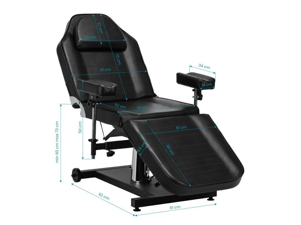 Táto hydraulická tetovacia stolička je navrhnutá s dôrazom na ergonómiu, stabilitu a pohodlie počas dlhých tetovacích alebo kozmetických procedúr. Plynulé nastavenie výšky v rozmedzí 60–73 cm umožňuje jednoduché nastavenie pracovnej polohy, zatiaľ čo ručné nastavenie operadla a opierky nôh poskytuje širokú škálu možností polohovania podľa potrieb klienta a povahy procedúry.