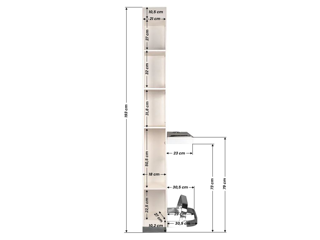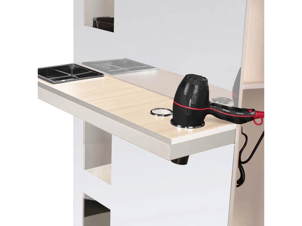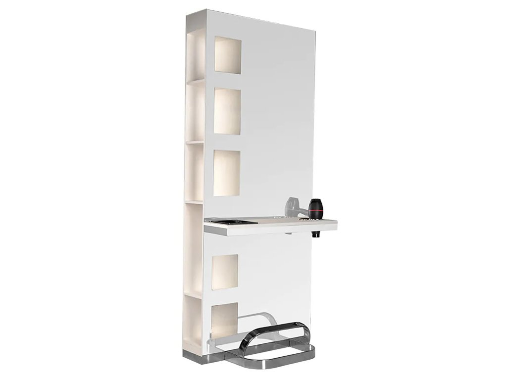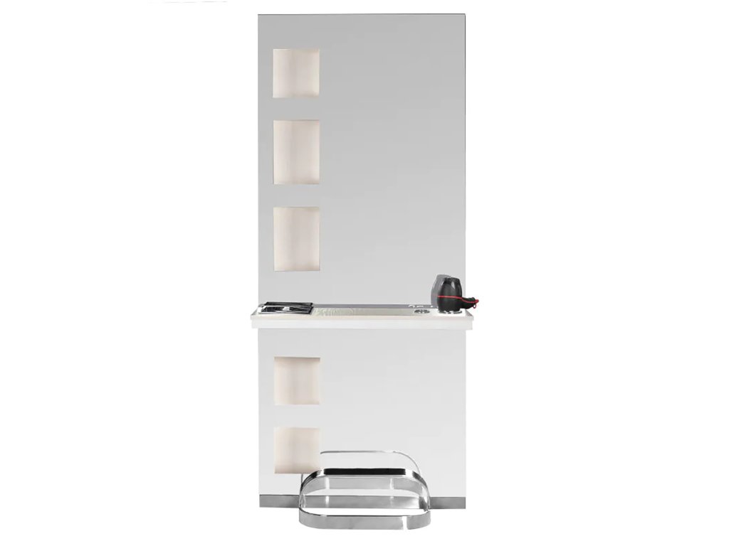 Moderné kadernícka konzola s veľkým zrkadlom a praktickými policami na oboch stranách. Obsah políc na jednej strane je viditeľný skrz "tabuľa". Špičková povrchová úprava. Elegantný a zároveň univerzálny prvok interiéru, ktorý podčiarkne charakter každého kaderníckeho salónu.