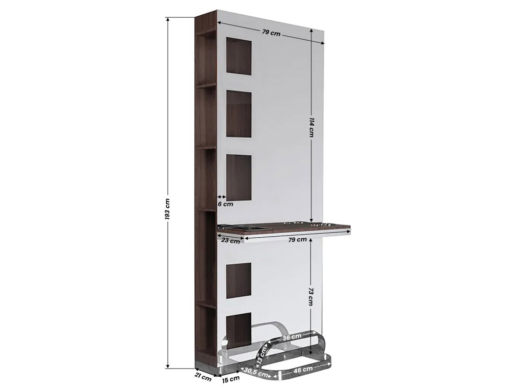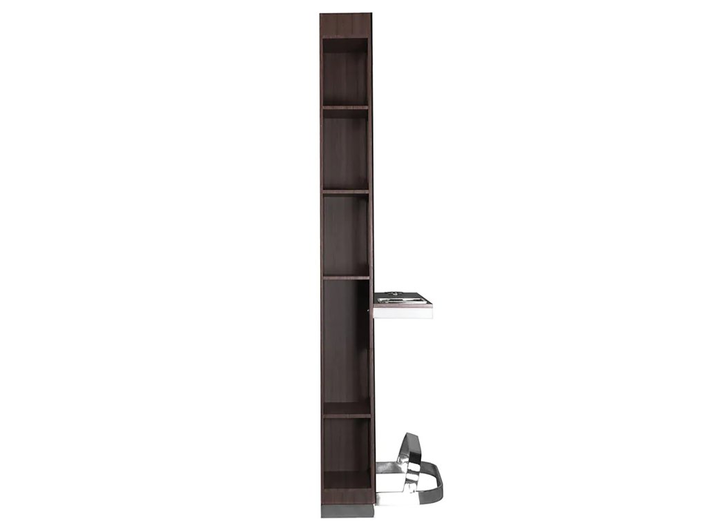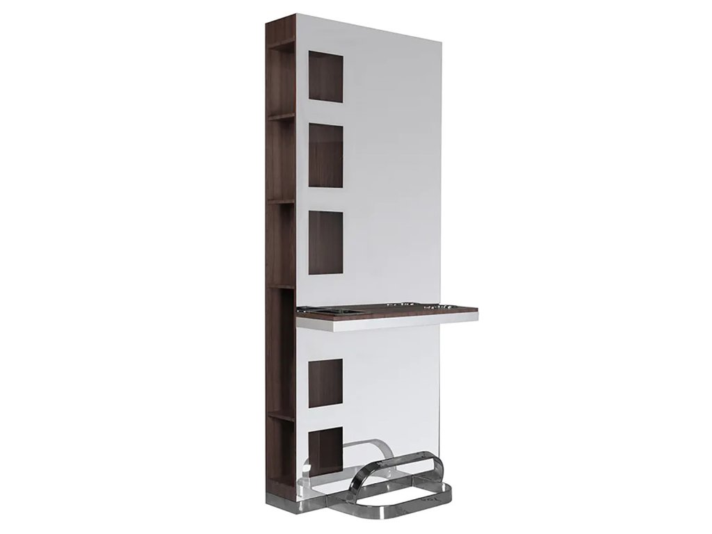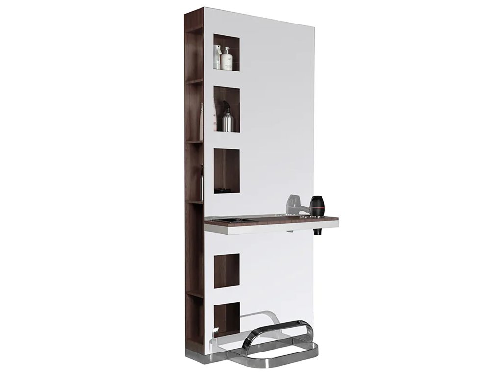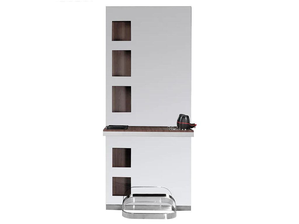 Moderné kadernícka konzola s veľkým zrkadlom a praktickými policami na oboch stranách. Obsah políc na jednej strane je viditeľný skrz "tabuľa". Špičková povrchová úprava. Elegantný a zároveň univerzálny prvok interiéru, ktorý podčiarkne charakter každého kaderníckeho salónu.