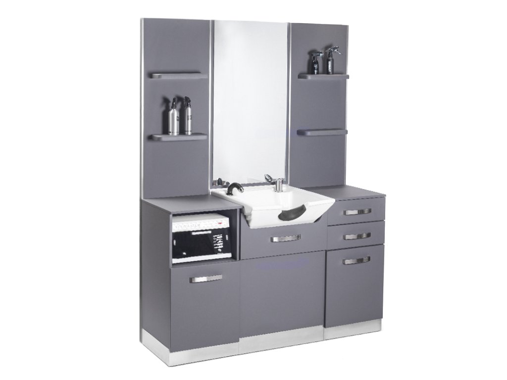 Veľké zrkadlo, umývadlo a zásuvky zaisťujú funkčnosť a celý nábytok je dokončený v najvyššej kvalite. Ide o elegantný a zároveň univerzálny prvok interiéru, ktorý zvýrazní charakter každého kaderníckeho salónu