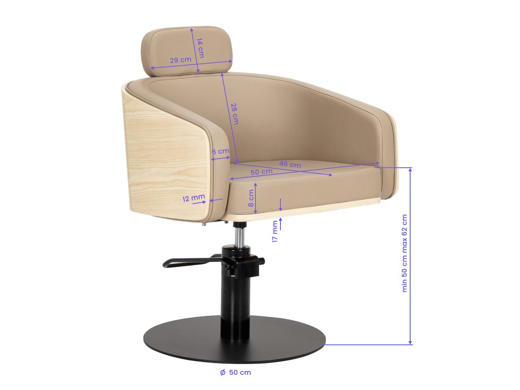Kadernícke kreslo Elegant Beige spája moderný dizajn, funkčnosť a maximálne pohodlie. Vďaka hydraulickému zdvihu s reguláciou výšky v rozmedzí 50–62 cm sa jednoducho prispôsobí potrebám kaderníka aj klienta. Výšku je možné nastaviť aj počas sedenia, čo zaisťuje plynulú a efektívnu prácu.