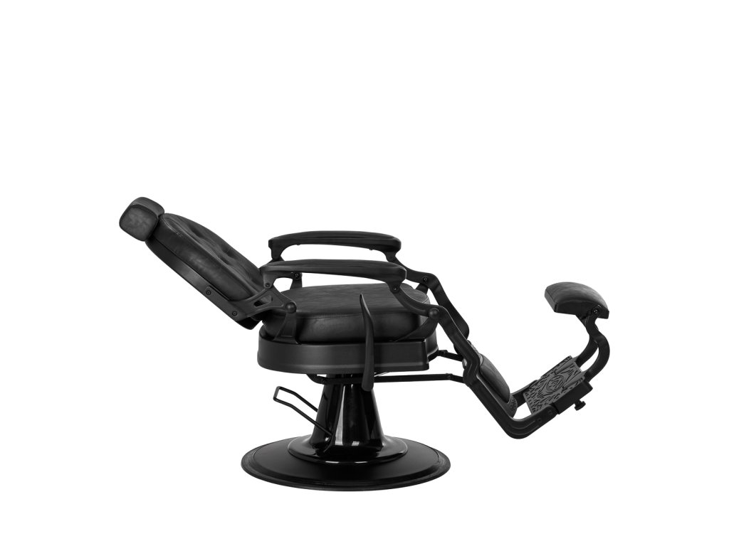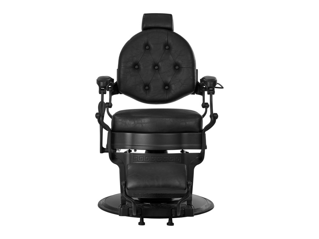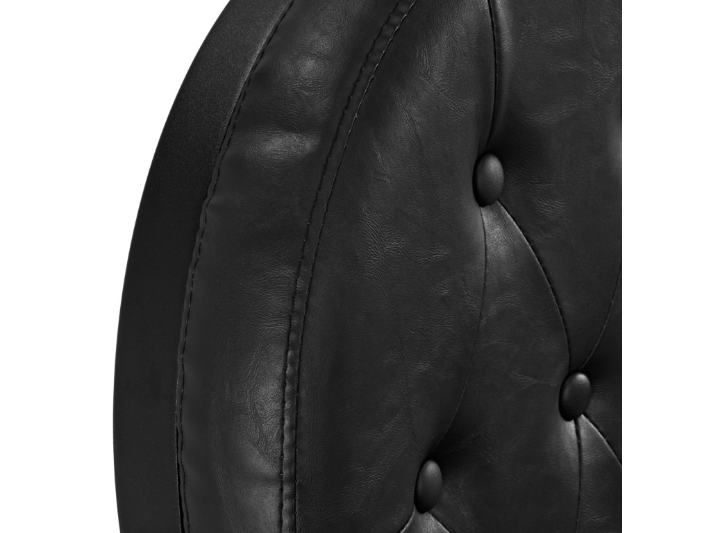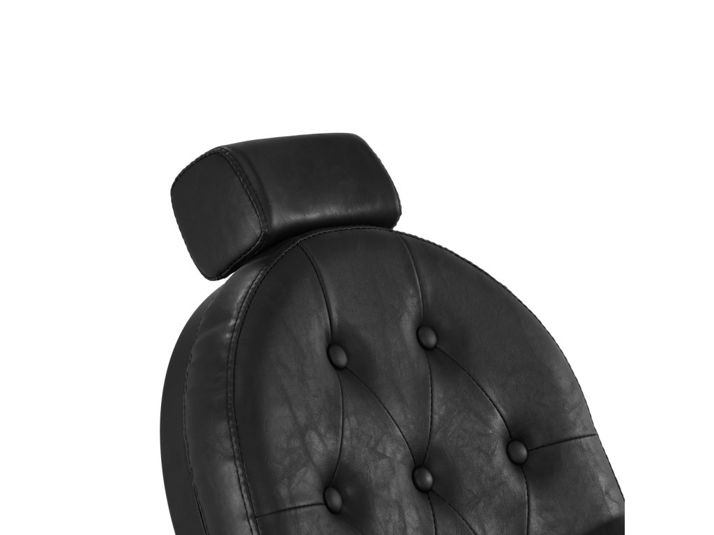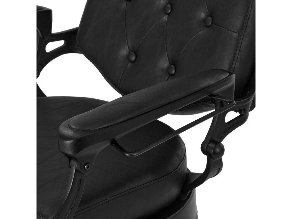 Pevná základňa zaručuje stabilitu a vysoký komfort používania. Výplň sedáku je vyrobená z odolnej peny odolnej voči deformáciám a čalúnenie je z na dotyk príjemnej syntetickej kože s polomatnou povrchovou úpravou, ktorá zabezpečuje odolnosť nábytku a jeho pohodlné používanie po dlhú dobu. Čierny poťah s prešívaním a ozdobnými gombíkmi mu dodáva jedinečný charakter. Vďaka svojmu výraznému dizajnu odkazujúcemu na vintage štýl kreslo dokonale zapadá do atmosféry holičstiev a podčiarkuje ich jedinečnú atmosféru.