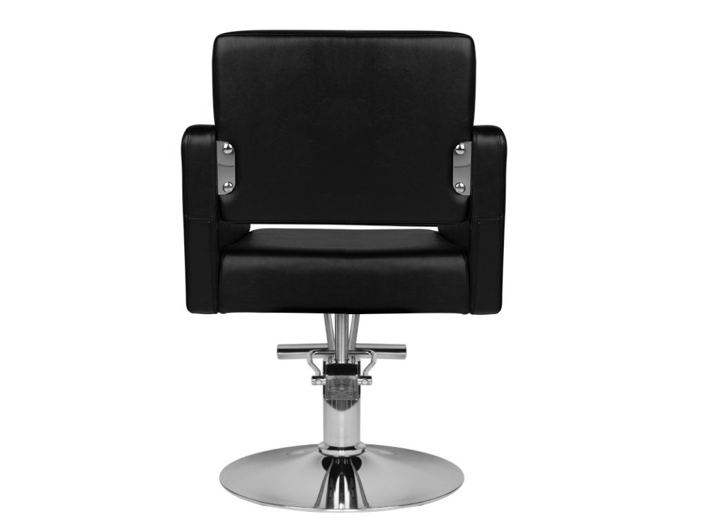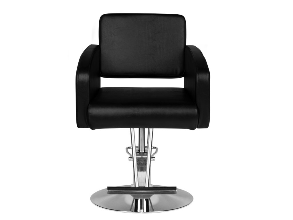 Moderné kadernícke kreslo značky HAIR SYSTEM. Elagantné a veľmi pohodlné. Pevný chrómovaný podstavec zaručuje stabilitu sedadla. Poťah je vyrobený z vysoko kvalitnej čiernej ekokože. Stolička je nastaviteľná hore a dole