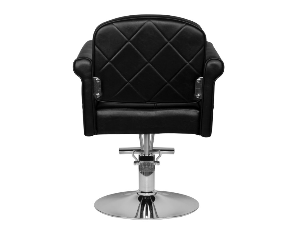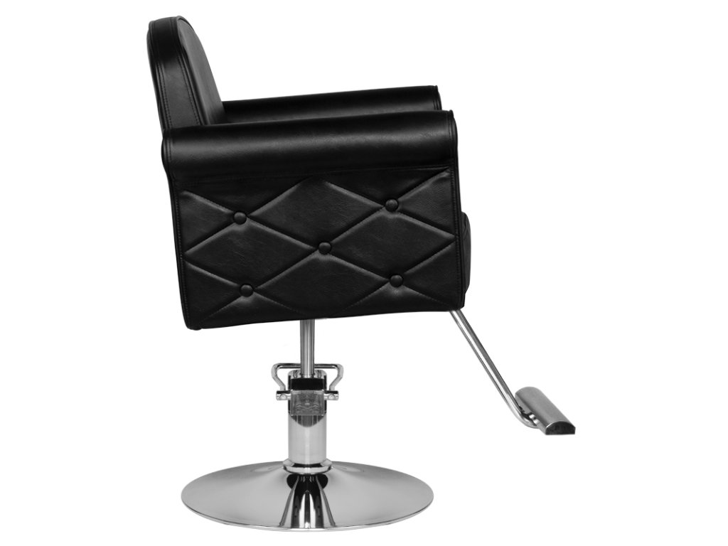 Moderné kadernícke kreslo značky HAIR SYSTEM. Elagantné a veľmi pohodlné. Pevný chrómovaný podstavec zaručuje stabilitu sedadla. Poťah je vyrobený z vysoko kvalitnej čiernej ekokože. Stolička je nastaviteľná hore a dole