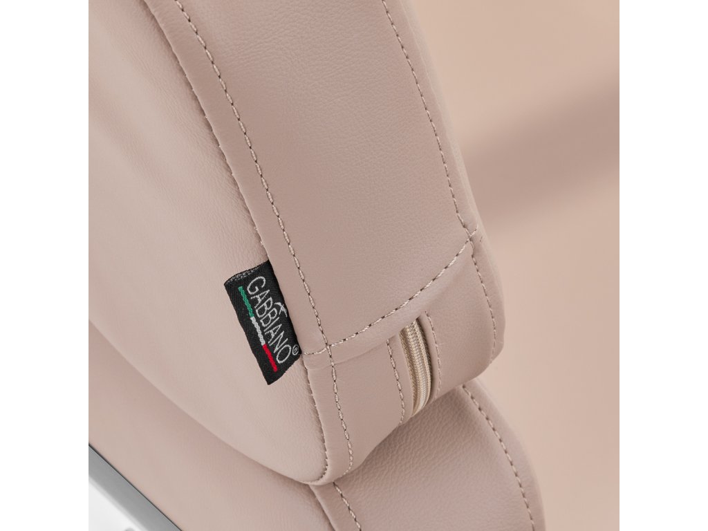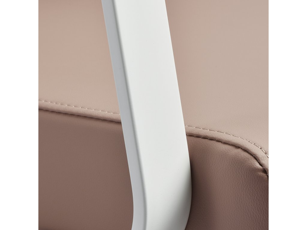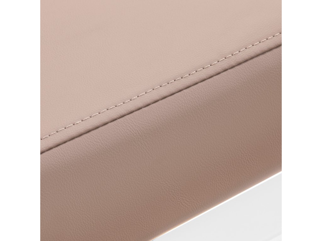 Čalúnenie v béžovom odtieni je vyrobené z kvalitnej syntetickej kože, ktorá je príjemná na dotyk, odolná voči vlhkosti a jednoducho sa udržiava. Pevná penová výplň zabezpečuje dlhodobý komfort a tvarovú stálosť. Kovové podrúčky v bielej farbe podporujú správne držanie tela a spolu so samostatnou podnožkou zvyšujú pohodlie klienta.