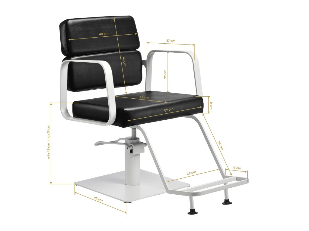 Robustná kovová základňa v tvare štvorca poskytuje pevnú stabilitu a bezpečnosť. Jej povrch je odolný voči opotrebovaniu a ľahko sa čistí. Ergonomicky tvarované operadlo a sedadlo ponúkajú klientovi pohodlnú oporu aj počas dlhších procedúr. Otvorený priestor medzi operadlom a sedadlom umožňuje jednoduchú údržbu a rýchle odstránenie vlasov.