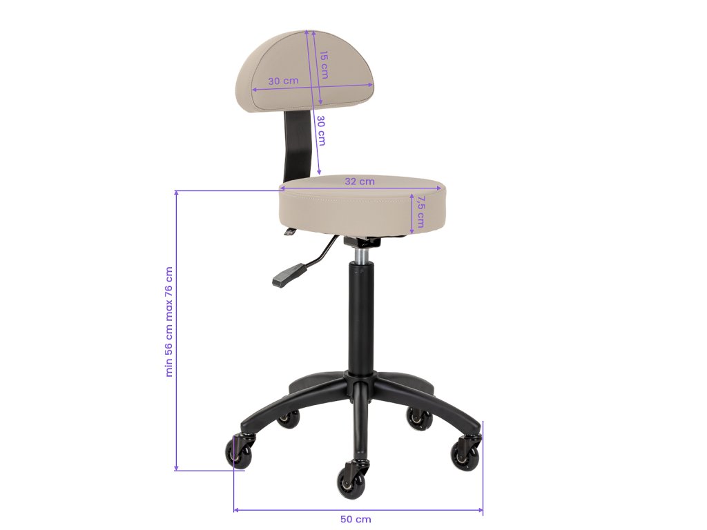 Tvarované operadlo podporuje správne držanie tela a pomáha znižovať únavu chrbtice aj pri dlhom sedení. Výškovo nastaviteľné sedadlo (56–76 cm) umožňuje prispôsobiť pozíciu individuálnym potrebám každého profesionála. Mechanizmus 360° otáčania zaručuje voľnosť pohybu a efektivitu pri práci.