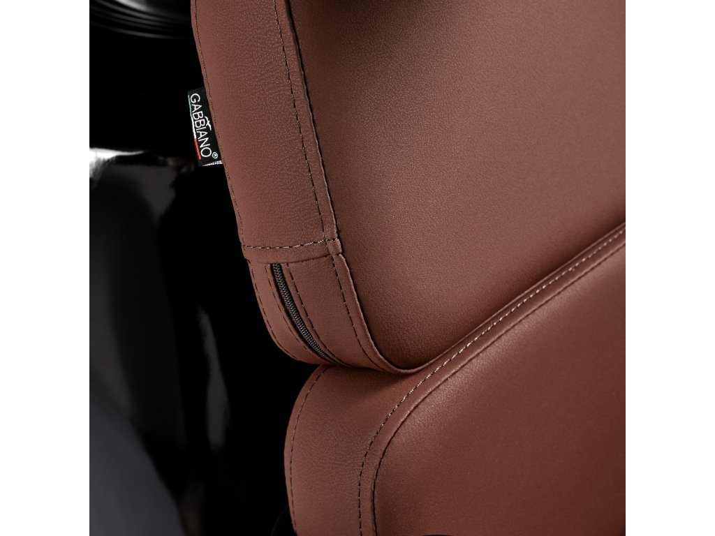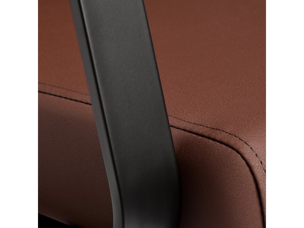 Čalúnenie v čokoládovom odtieni je vyrobené z odolnej syntetickej kože, ktorá je príjemná na dotyk, nenáročná na údržbu a odolná voči opotrebovaniu. Výplň z pevnej peny zaručuje dlhú životnosť a pohodlie aj pri častom používaní. Kovové podrúčky v čiernom prevedení poskytujú správnu oporu ramien a väčší komfort pre klienta.
