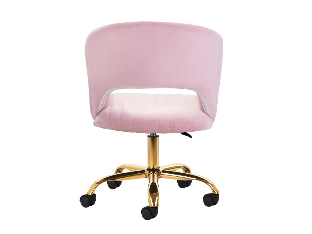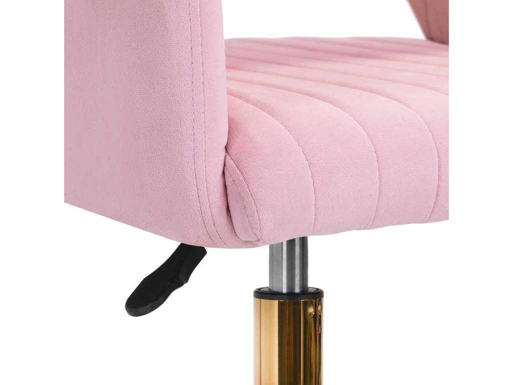 Tento kus nábytku zaujme na prvý pohľad svojím starostlivým spracovaním. Zamatové čalúnenie v ružových odtieňoch, ktoré je príjemné na dotyk, mu dodáva jedinečný charakter. Podstavec v zlatej farbe dodáva eleganciu a dokonale ladí so zamatom, zatiaľ čo funkčné kolieska zaisťujú mobilitu, takže kreslo možno pri práci ľahko premiestňovať a presúvať po obývacej izbe. Estetika spracovania, pohodlie pri používaní, ozdobné prešívanie a ergonomicky profilované operadlo znamenajú, že kreslo splní požiadavky aj tých najnáročnejších používateľov.