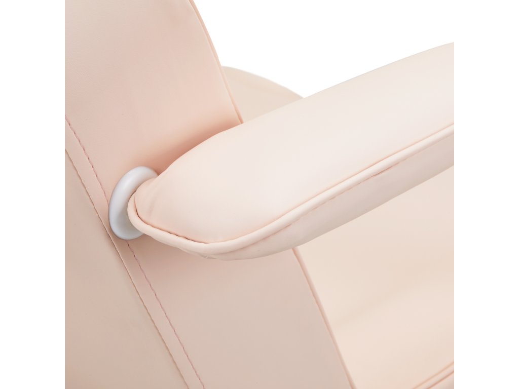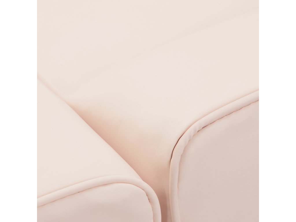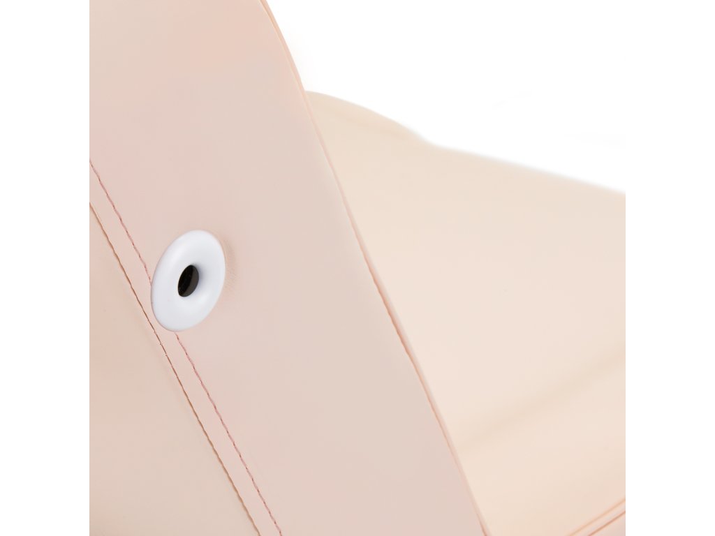 Základňa stoličky má pevnú výšku, takže sedadlo je v konštantnej úrovni, čo by malo zabezpečiť pohodlie počas používania. Pevný kovový rám v odtieňoch bielej farby a protišmykové nožičky zabezpečujú potrebnú stabilitu počas používania. Stolička je vyplnená penou a potiahnutá imitáciou kože v ružových odtieňoch. Vďaka použitiu tohto materiálu je zariadenie pohodlné na používanie, odolné voči vlhkosti a ľahko sa čistí. Vhodne tvarované okraje dodávajú stoličke ergonomický tvar. Vďaka jednoduchému dizajnu a elegantnému farebnému prevedeniu ľahko zapadne do každého interiéru.