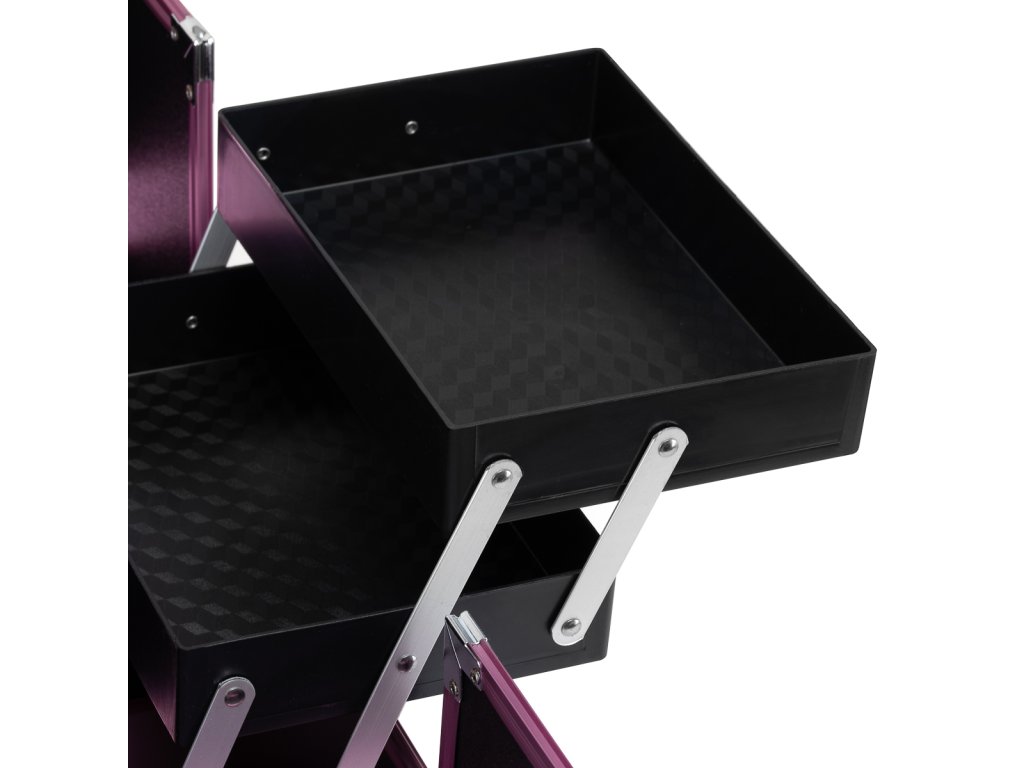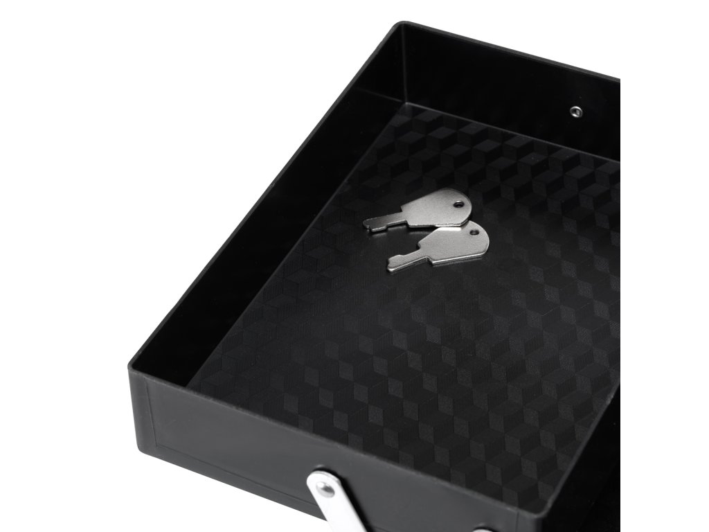 Vnútorný priestor kufríka je dômyselne riešený – obsahuje výsuvné priehradky pre menšie nástroje a príslušenstvo, zatiaľ čo hlavná komora pojme väčšie vybavenie, ako napr. frézu, fľaštičky s prípravkami alebo UV lampu. Konštrukcia kufríka je vyrobená z odolných materiálov, ktoré zabezpečujú dlhú životnosť a každodenný komfort pri používaní.